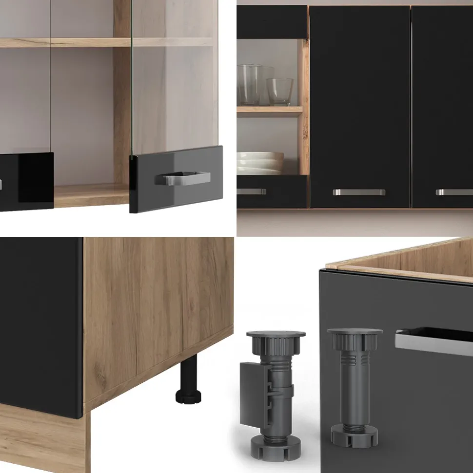 - Die Küchenzeile ist modular aufstellbar und kann je nach Bedarf erweitert werden. Dank höhenverstellbarer Füße ist ein individuelles Anpassen möglich.