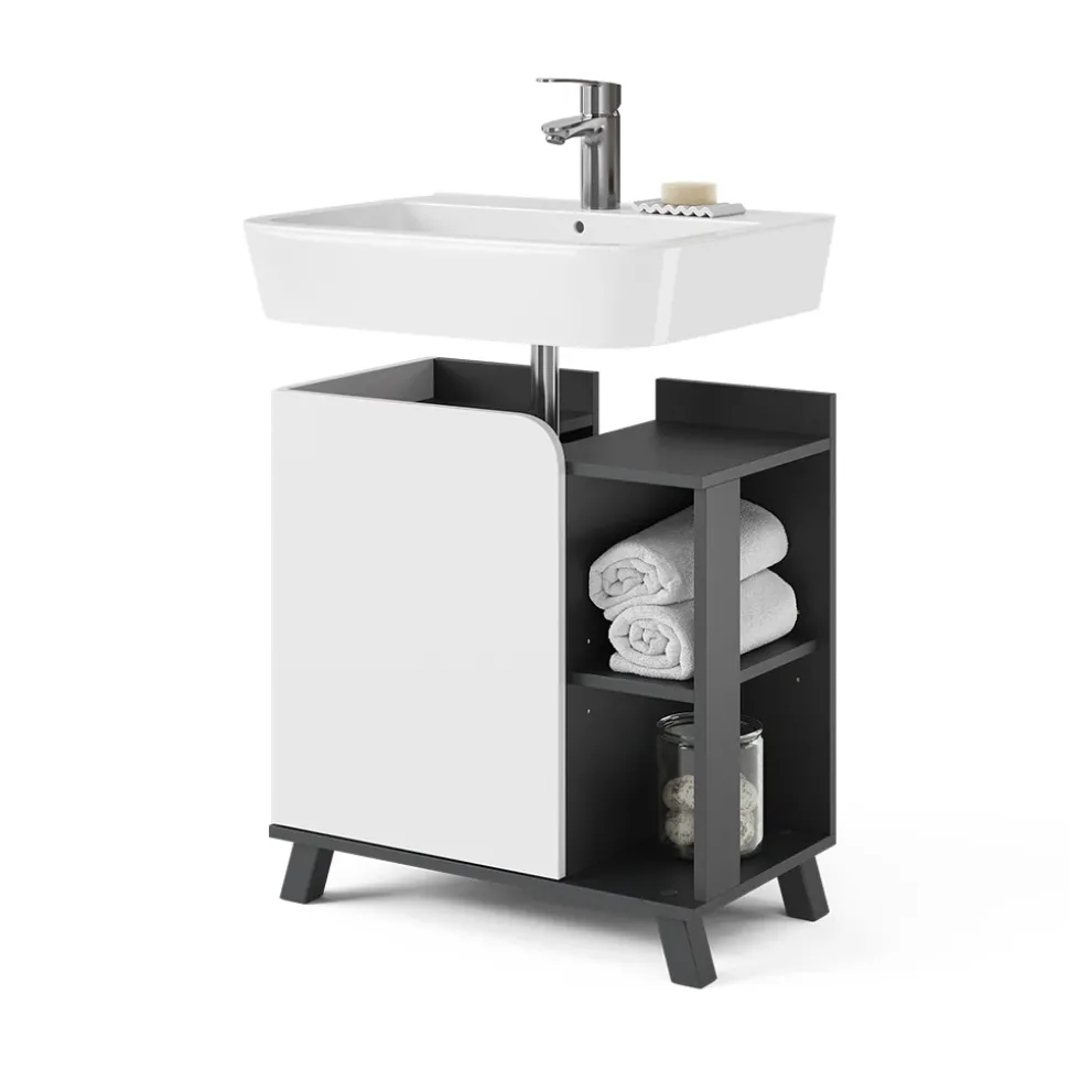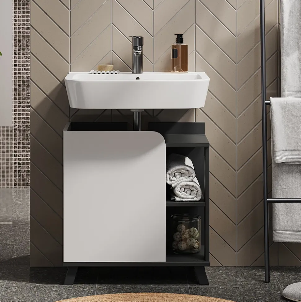 Entdecken Sie eine Welt des großzügigen Stauraums, der durch die geschickte Kombination von Türen und offenen Fächern geboten wird. Tauchen Sie ein in ein modernes Design, das zweifarbig ist und Ihrem Raum einen zeitgemäßen und stilvollen Look verleiht. Die pflegeleichte Oberfläche dieses Waschbeckenschrankes ermöglicht es Ihnen, die Schönheit Ihrer Einrichtung ohne großen Aufwand zu bewahren. Und wenn es um die Montage geht, erweist sich Ihr Schrank als unkompliziert wie funktional, sodass Sie Ihr neues Badmöbelstück in Szene setzen können.