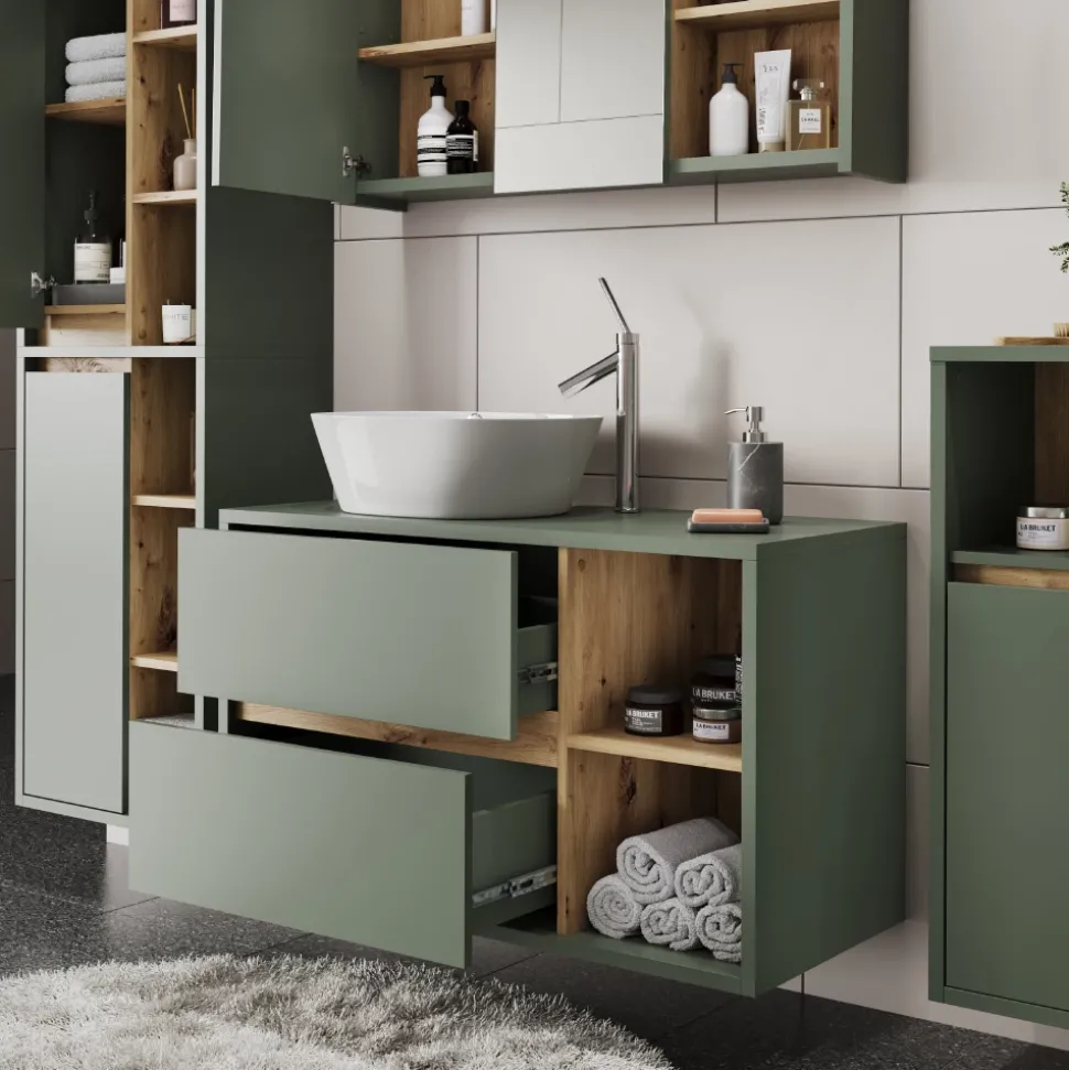 Kompakt, modern, überzeugend – unsere Badmöbelserie Viola wird Sie begeistern. Der Waschtischunterschrank mit vorgefräster Syphon-Aussparung bietet ausreichend Platz, um alle Badutensilien problemlos unterzubringen. Zudem lassen sich dekorative Elemente stilvoll integrieren.Die Badmöbelserie ist in vier unterschiedlichen Farbvarianten erhältlich: edler Artisan mit Anthrazit-Holz-Look, Weiß matt mit Anthrazit-Look, Anthrazit mit Artisan-Look sowie Grau mit Anthrazit-Look. Diese Design-Highlights fügen sich harmonisch in jedes Bad ein und machen es zum Blickfang in Ihrem Zuhause.Dank der im Lieferumfang enthaltenen, bebilderten Montageanleitung ist der Aufbau kinderleicht!