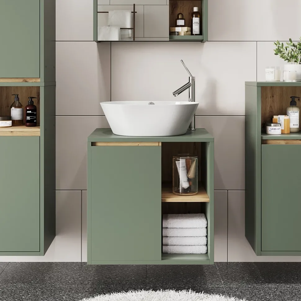 Der Waschbeckenunterschrank Viola vereint modernes Design mit praktischer Funktion. Eine Tür sowie zwei offene und zwei geschlossene Fächer bieten ausreichend Stauraum für Badutensilien. Ideal für kleine Badezimmer – für mehr Ordnung, Stil und eine elegante Note.