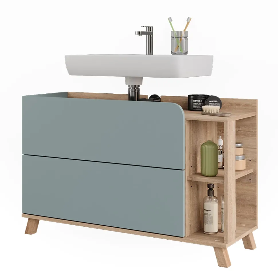 Der Waschbeckenunterschrank Karen ist die perfekte Lösung für ein aufgeräumtes Badezimmer mit Stil. Mit seinen zwei offenen Fächern und zwei geräumigen Schubladen bietet er jede Menge Stauraum für Handtücher, Kosmetik und alles, was man im Bad benötigt. Das moderne Design des Badmöbels passt in jedes Badezimmer und überzeugt mit seiner schlichten Eleganz. Dank der Push-to-open-Funktion lassen sich die Schubladen spielend leicht öffnen und schließen. Holen Sie sich mit dem Waschbeckenunterschrank Karen praktische Funktionalität und zeitlose Ästhetik in Ihr Badezimmer!