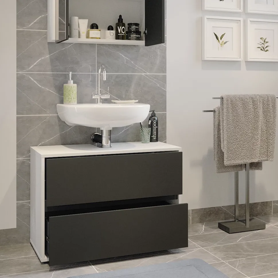 Der Waschtischunterschrank Maltin ist der perfekte Stauraum in Ihrem Badezimmer. Dank der zwei großen Schubladen bietet dieser moderne Badschrank viel Platz für Ihre Badaccessoires. Der Maltin- Waschbeckenunterschrank verfügt außerdem über eine Aussparung für einen Siphon, so dass Sie ihn einfach an Ihr Waschbecken anschließen können. Der Waschtischunterschrank ist auch mit anderen Produkten aus der Maltin-Kollektion kompatibel und sorgt so für einen stilvollen Look in Ihrem Bad.
