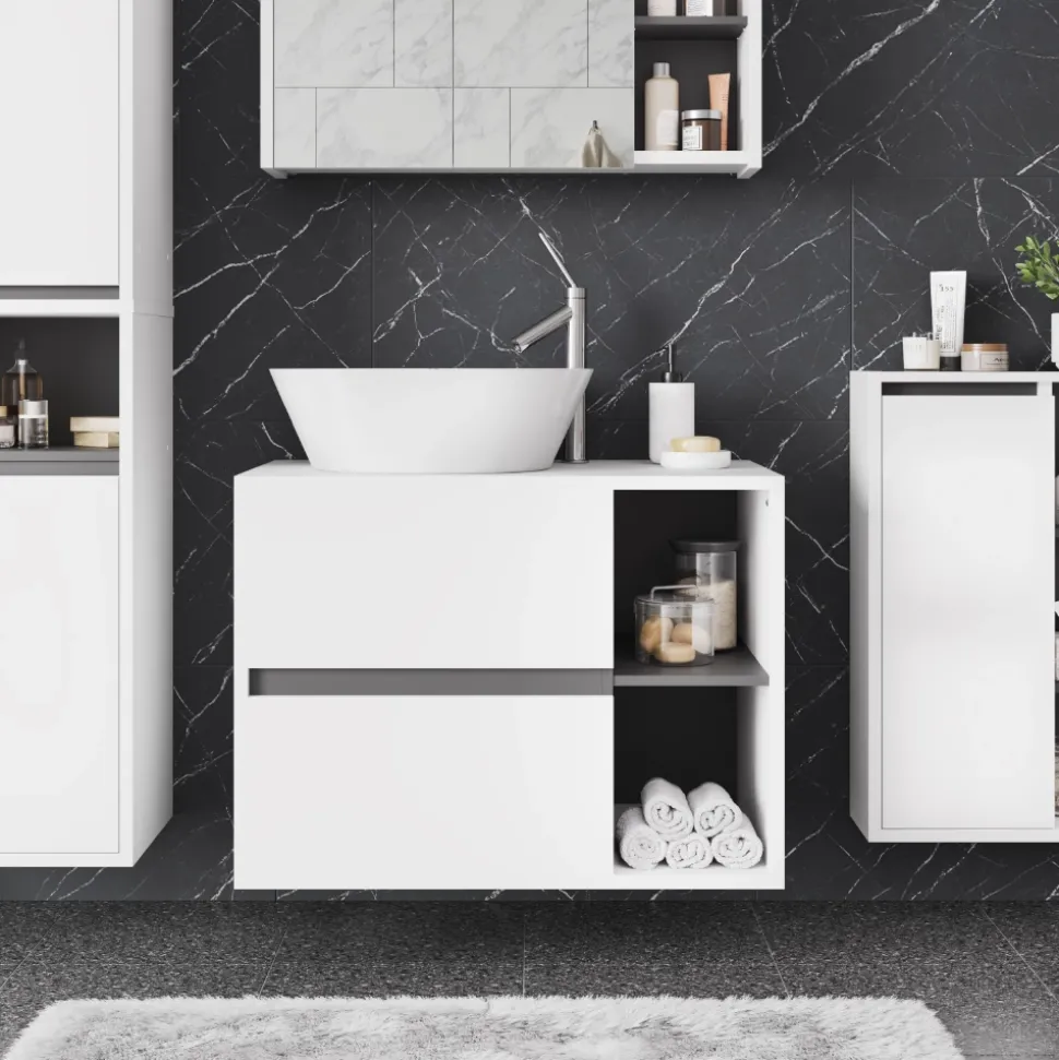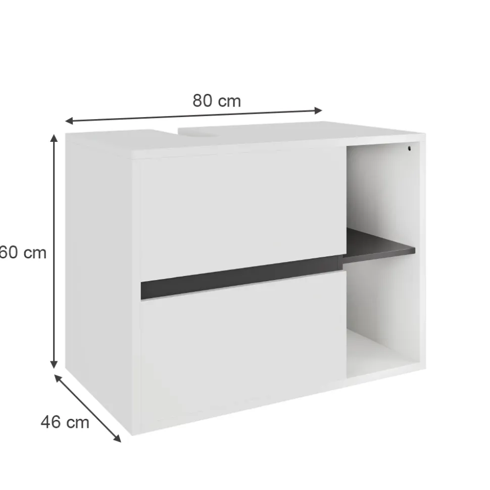 - MAßE: Der Unterschrank fürs Badezimmer misst 80 cm in der Breite, 60 cm in der Höhe und 46 cm in der Tiefe.