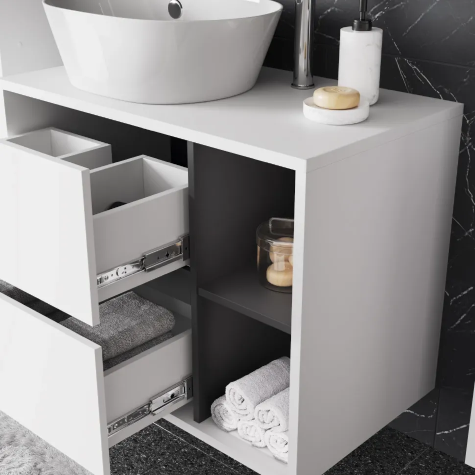 - Der Waschtischunterschrank verfügt über zwei Schubladen und zwei offene Fächer. Die Siphon-Aussparung ermöglicht eine platzsparende Wandmontage.