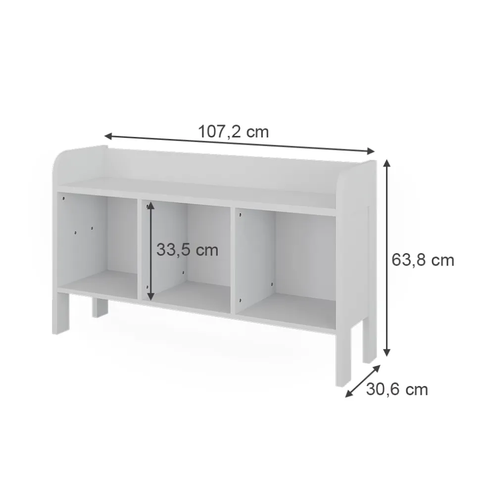 - MAßE: Das Bücherregal für Kinder hat eine Tiefe von 30,6 cm, eine Breite von 107,2 cm und eine Höhe von 63,8 cm.