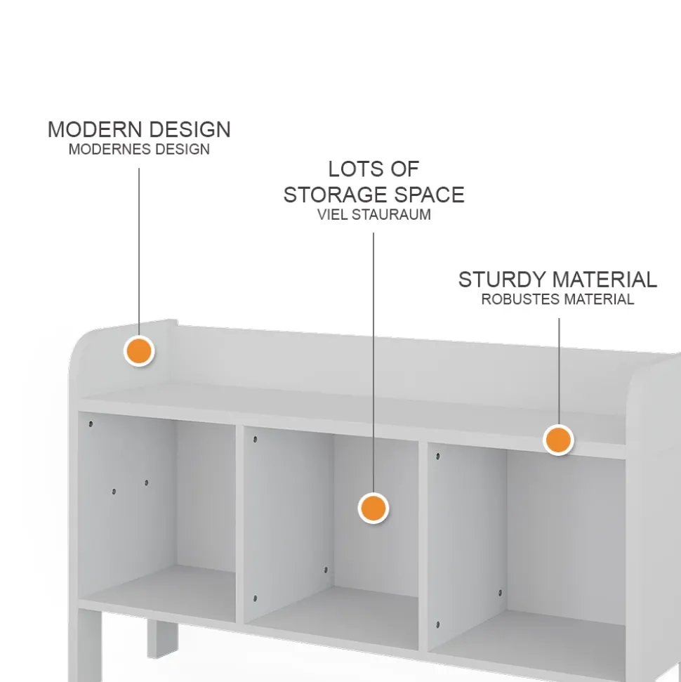 - Das Spielzeugregal mit Sitzbank ist ein praktisches Möbelstück für Kinder, das sowohl als Aufbewahrungsort für Spielzeug als auch als Sitzgelegenheit genutzt werden kann.