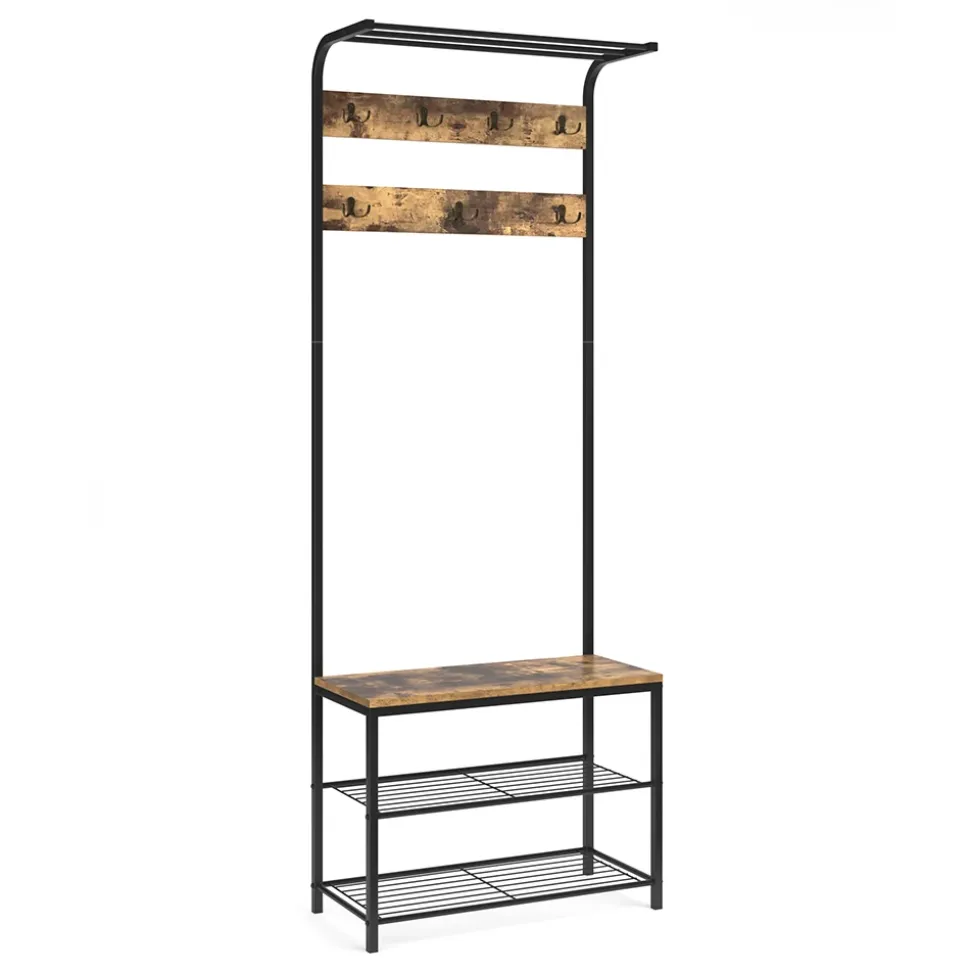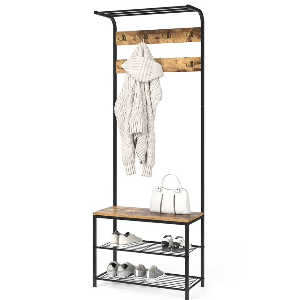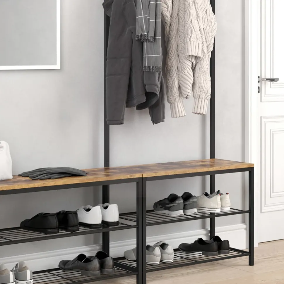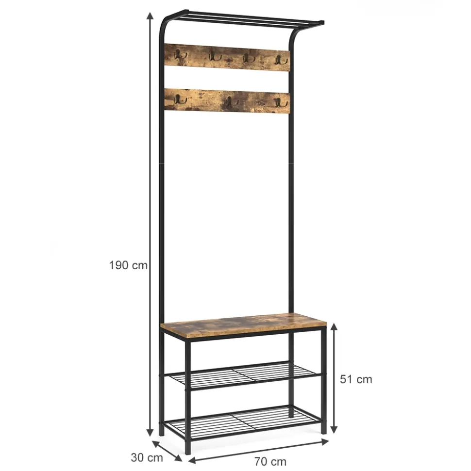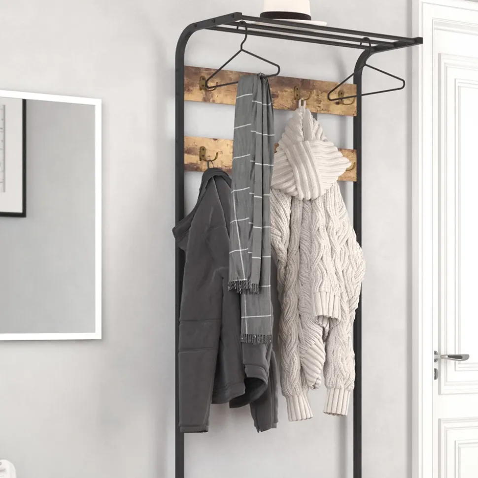 - Die vielen Kleiderhaken und die Hut- und Schuhablagen bieten viel Stauraum und wirken durch die luftige Rahmenkonstruktion dennoch leicht und modern.