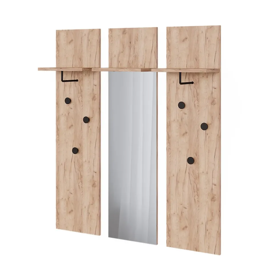Die Wandgarderobe Siri ist die perfekte Lösung, um Ihren Flur ordentlich und stilvoll zu gestalten. Das Garderobenset bietet Ihnen genügend Platz für Jacken, Mäntel und Accessoires.. Der Wandspiegel dient nicht nur als praktisches Utensil beim Verlassen des Hauses, sondern auch als dekoratives Element, das Ihrem Flur eine persönliche Note verleiht. Mit der Flurgarderobe wird Ihr Eingangsbereich zu einem einladenden und organisierten Raum, der Ihren Gästen sofort ein Gefühl von Wärme und Gastfreundschaft vermittelt.