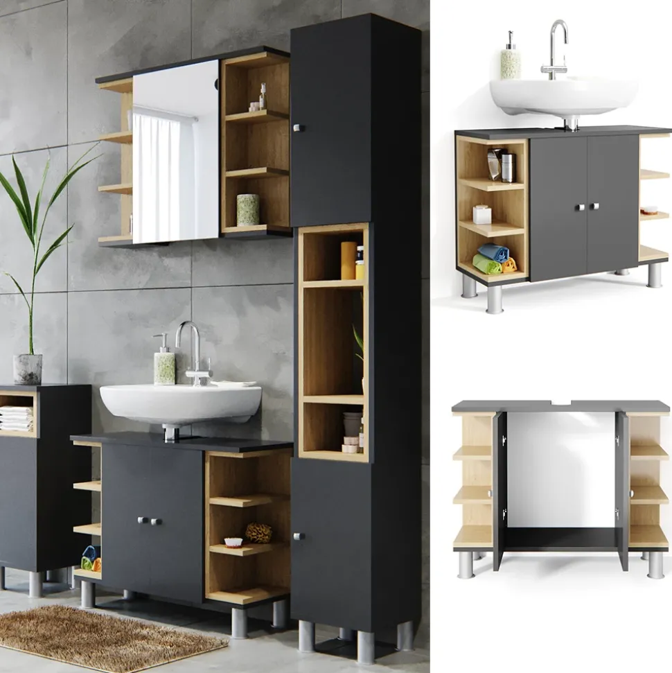 - Der Waschtischunterschrank hat zwei Flügeltüren und sechs offene Einlegeböden. Für einen Siphon ist eine Aussparung vorhanden. Die Füße des Möbelstücks sind aus Metall.