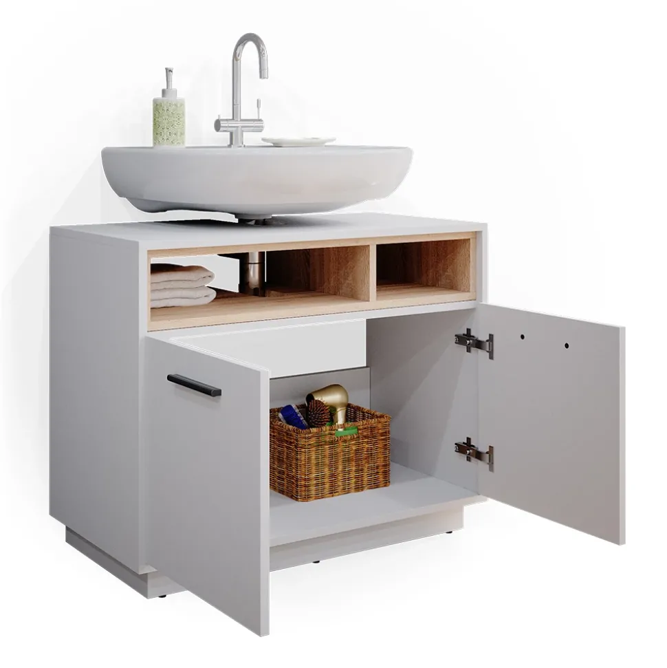 - Der Waschtischunterschrank hat zwei Flügeltüren und 2 offene Ablageflächen. Es gibt eine Aussparung für einen Siphon, reichlich Stauraum.