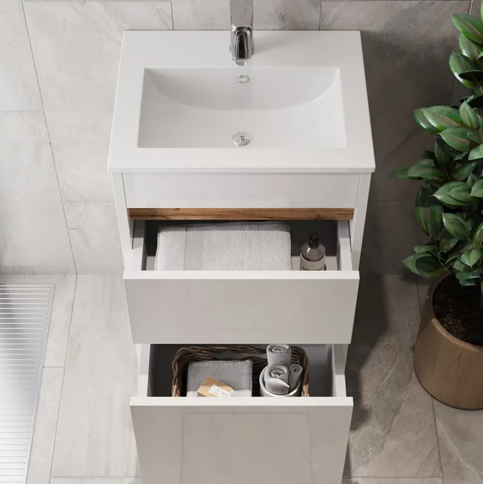 - Ein gut durchdachtes Set mit Waschbeckenunterschrank, das für jede Wohnung geeignet ist.
