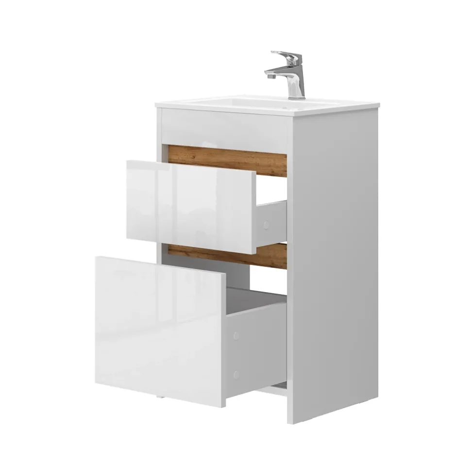 - MATERIAL: Das Badmöbel-Set besteht aus pflegeleichter, melaminharzbeschichteter 16 mm Spanplatte. Das Waschbecken ist aus Keramik gefertigt