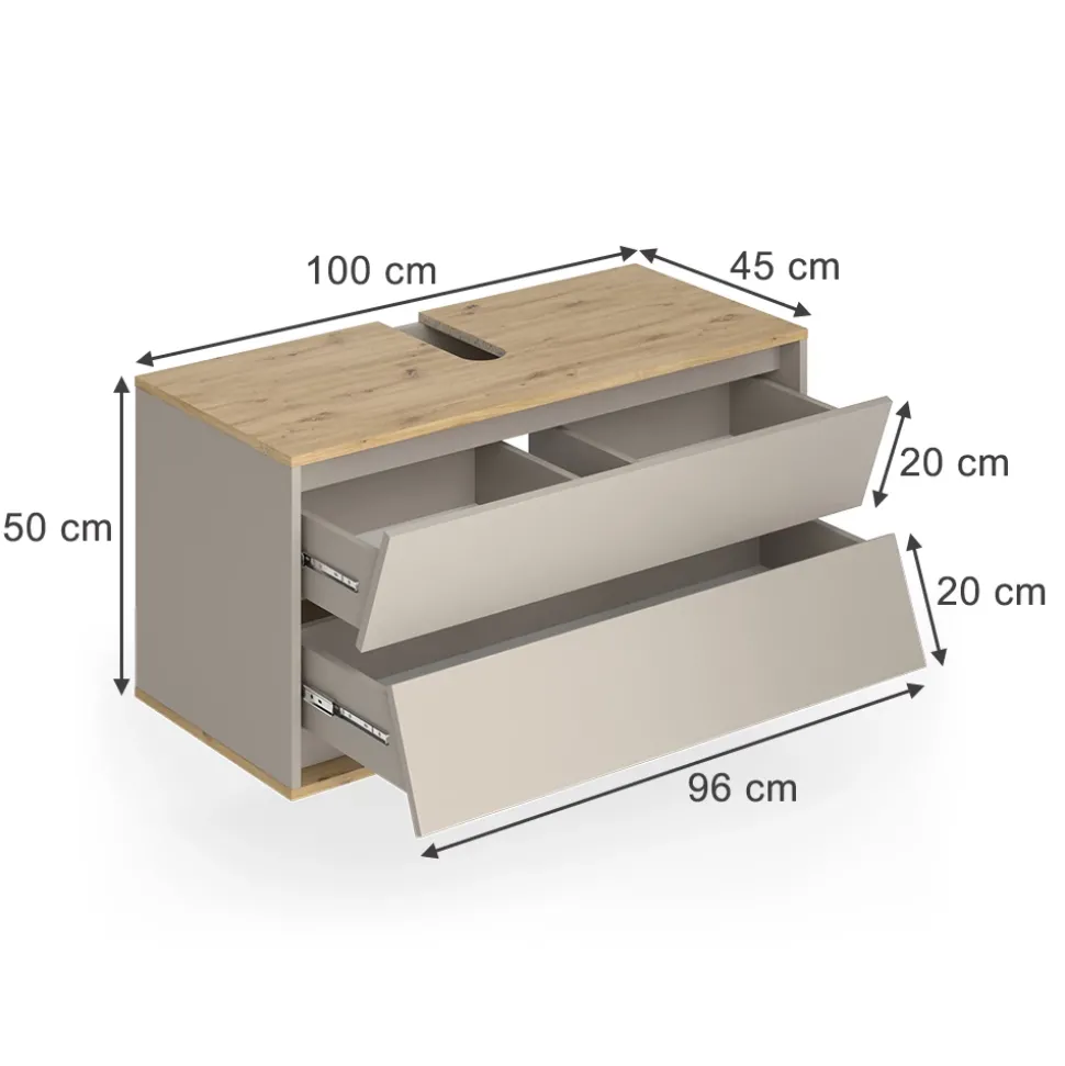 - MAßE: Der Unterschrank für das Badezimmer hat eine Tiefe von 45 cm, eine Breite von 100 cm und eine Höhe von 50 cm.