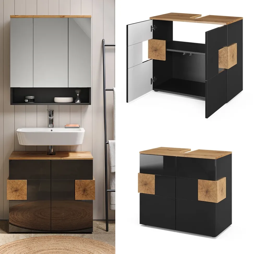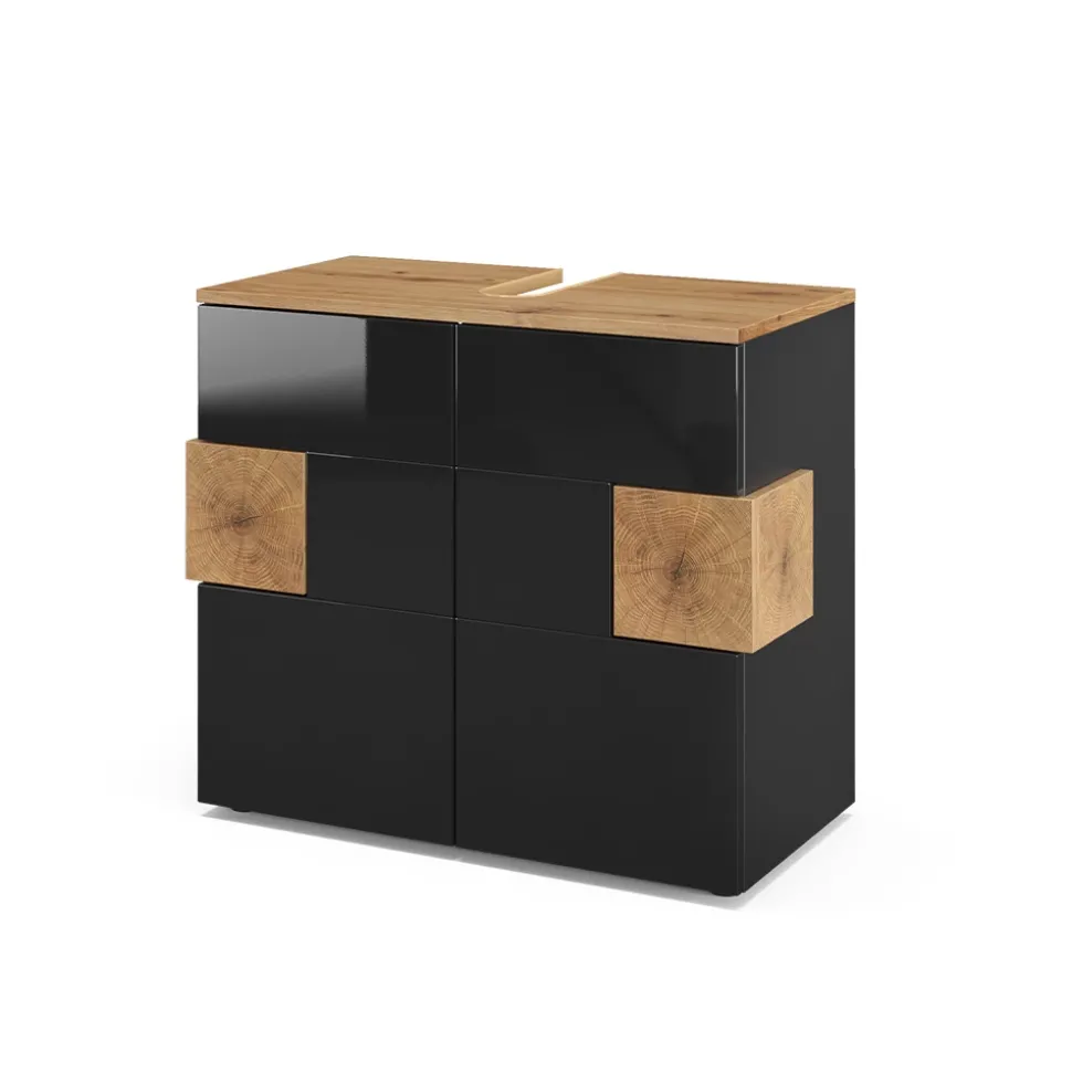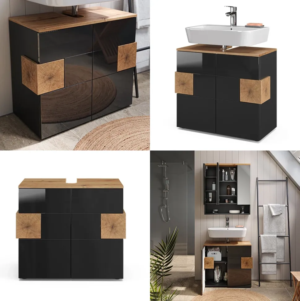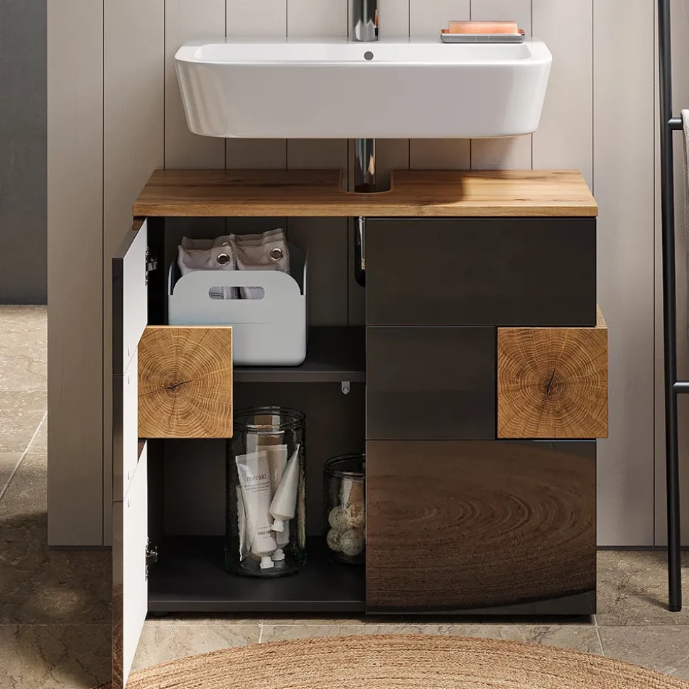 - Der Waschtischunterschrank bietet mit seinen zwei Flügeltüren und einer Ablagefläche ausreichend Stauraum. Eine Aussparung für den Siphon sorgt für eine perfekte Passform.