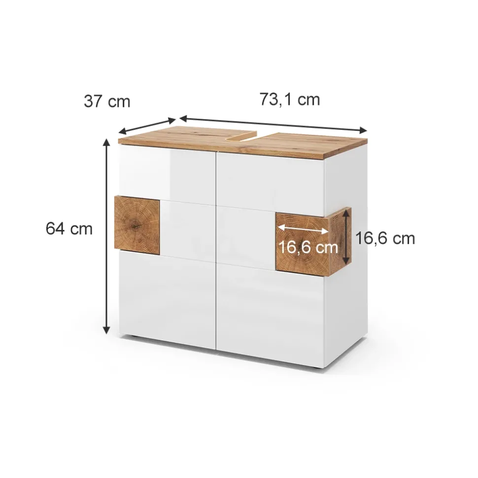 - MAßE: Der Unterschrank für das Badezimmer hat folgende Abmessungen: Breite: 73,1 cm, Höhe: 64 cm, Tiefe: 37 cm. Alle detaillierten Größen sind auf den Fotos angegeben.