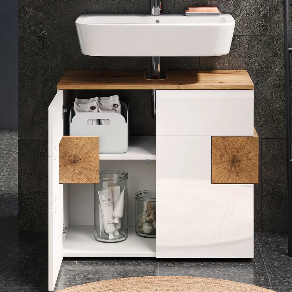 - Dieser edle Waschbeckenunterschrank besticht durch seine Zwei-Farben-Kombination.