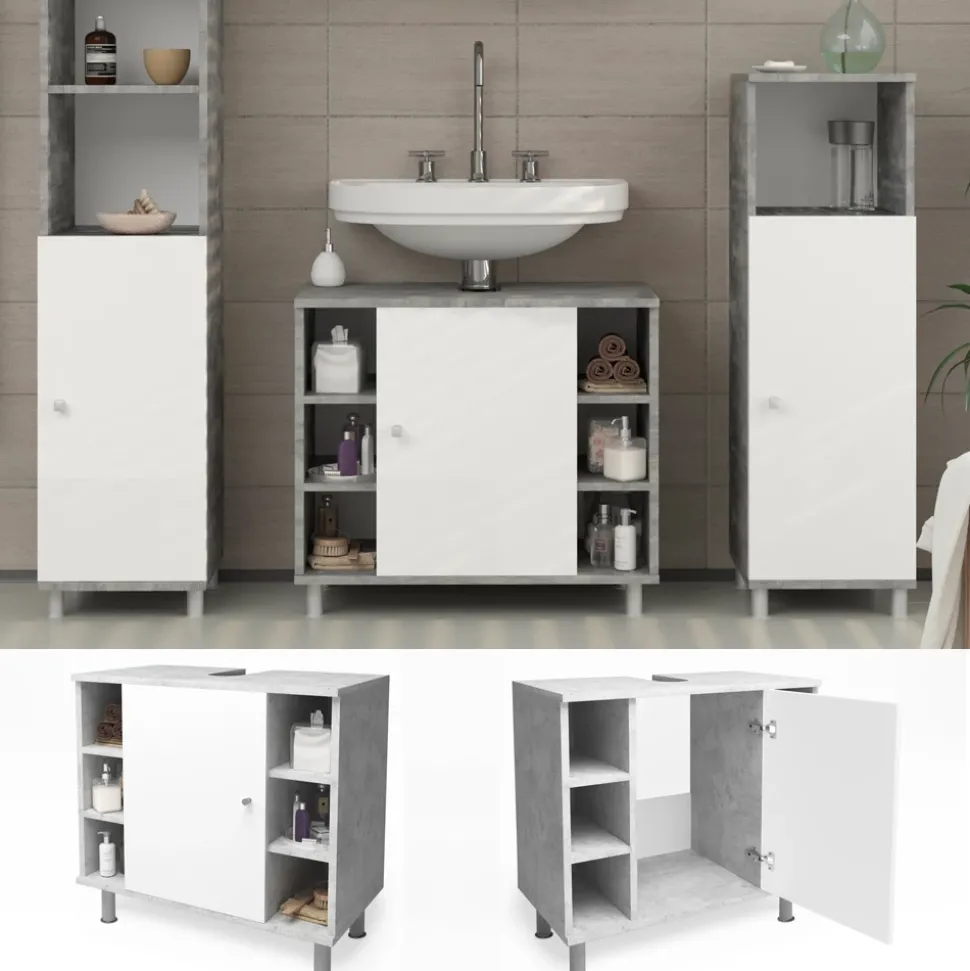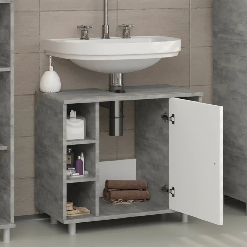 - Der Waschtischunterschrank hat eine Flügeltür und 6 offene Ablageflächen. Es gibt eine Aussparung für einen Siphon. Metallfüße sorgen für Standfestigkeit.