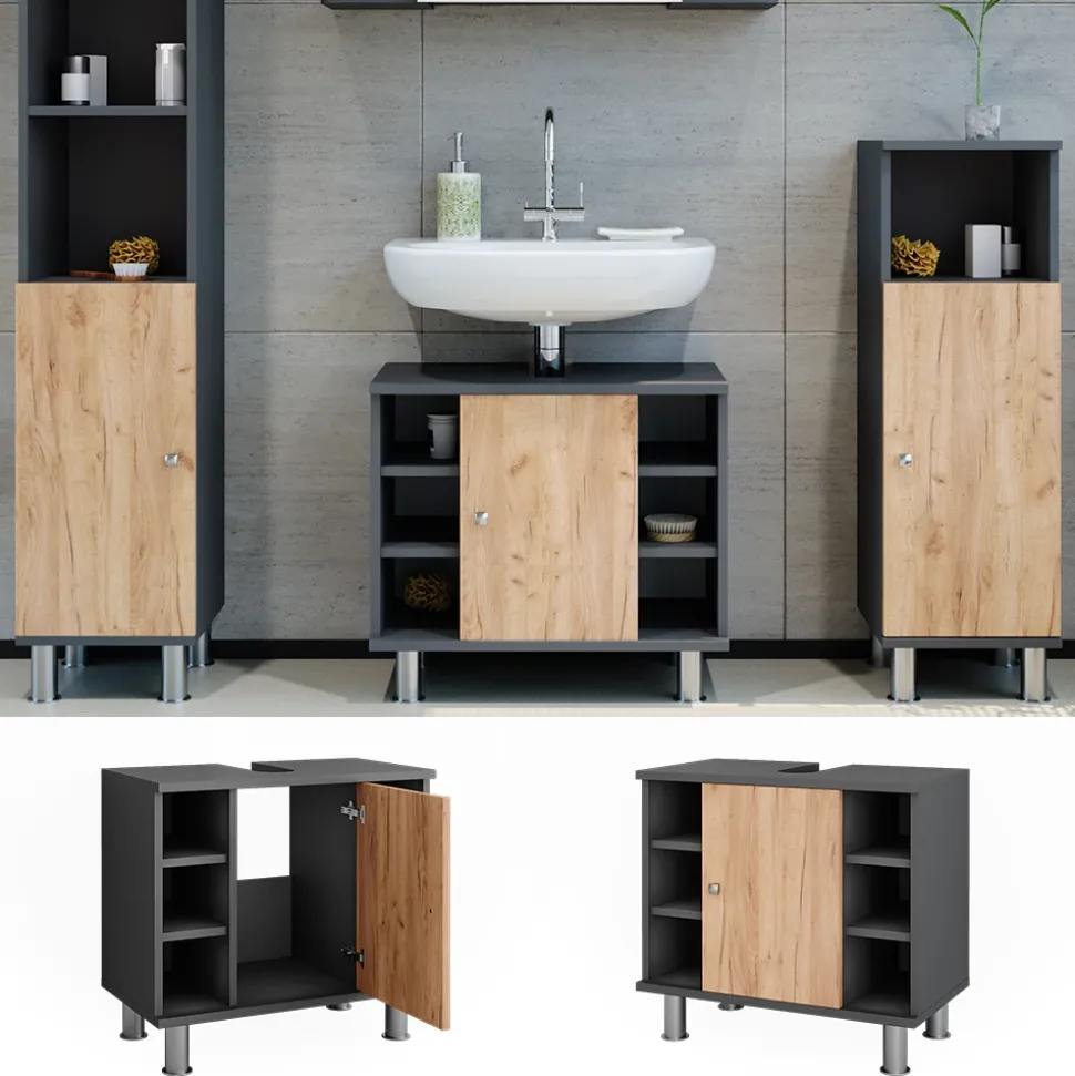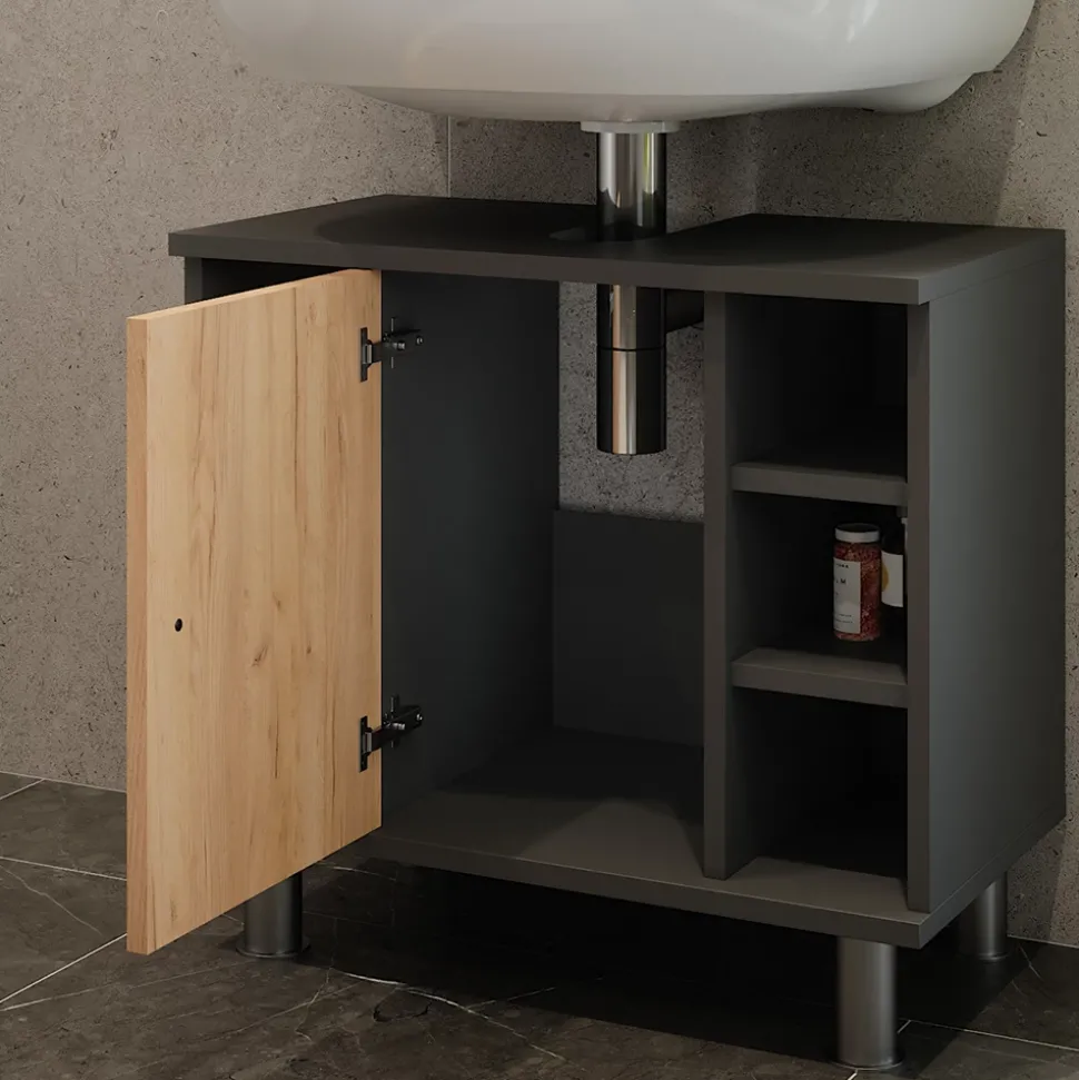 - Der Waschtischunterschrank verfügt über sechs offene Ablagen und bietet reichlich Stauraum. Eine Aussparung für den Siphon sorgt für eine praktische Nutzung im Badezimmer.