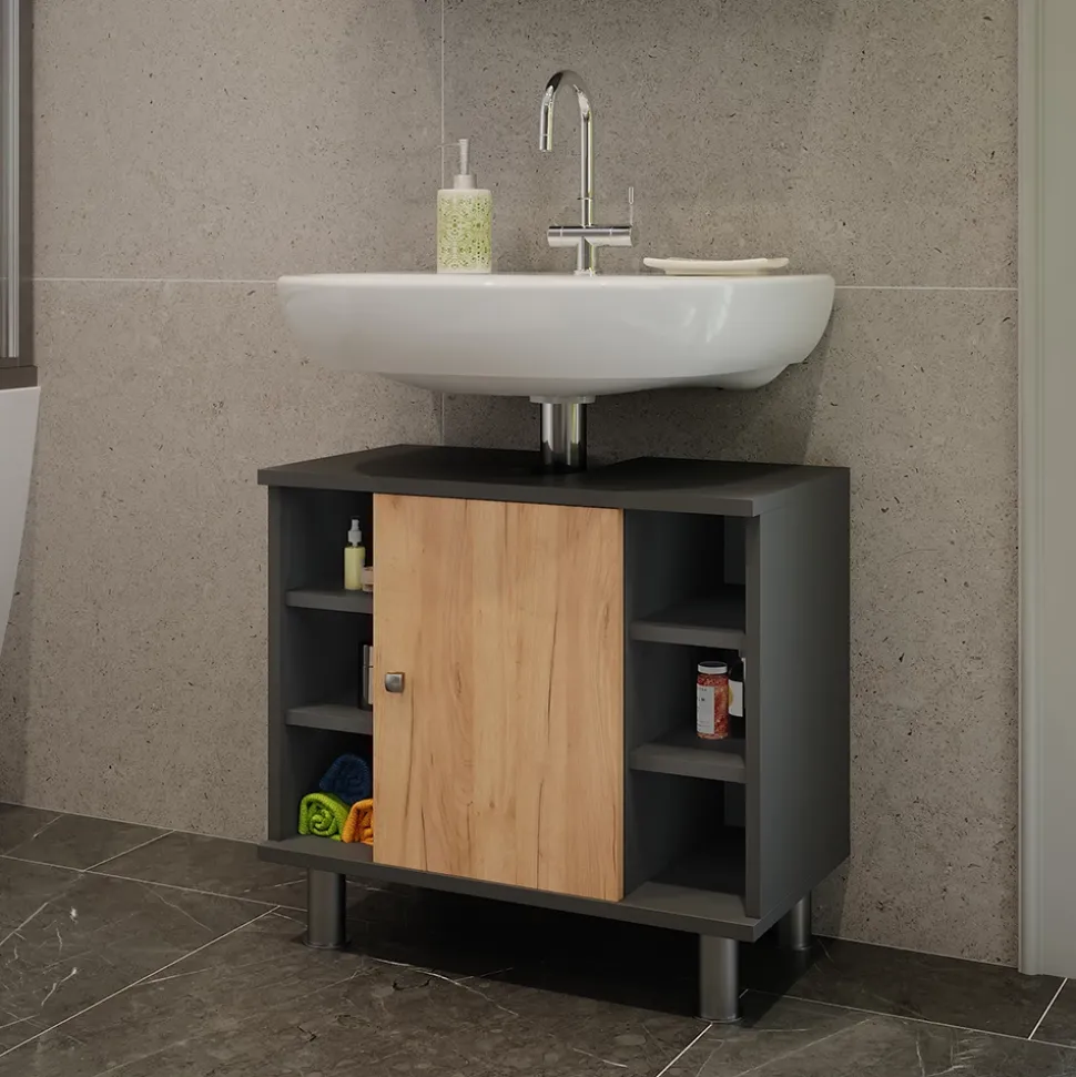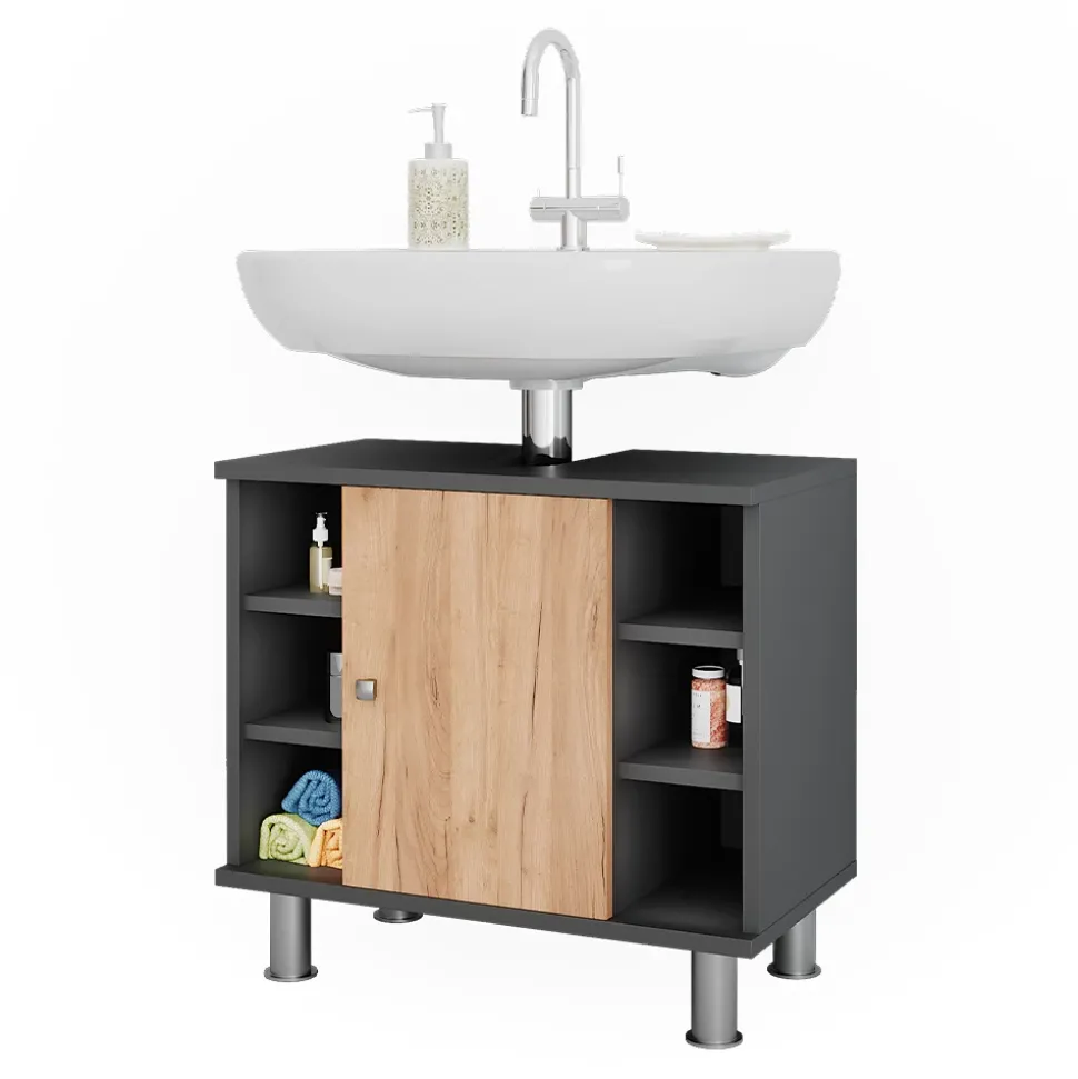- MATERIAL: Der Waschbeckenunterschrank besteht aus einer pflegeleichten 16 mm Spanplatte mit Melaminharzbeschichtung.