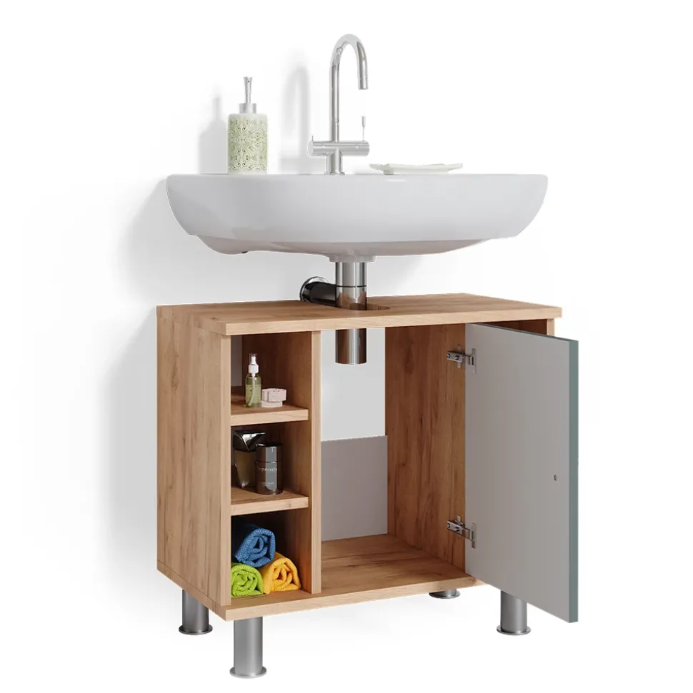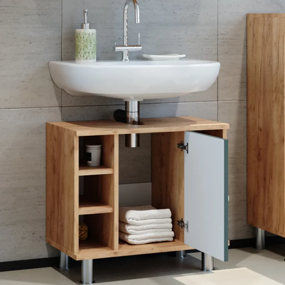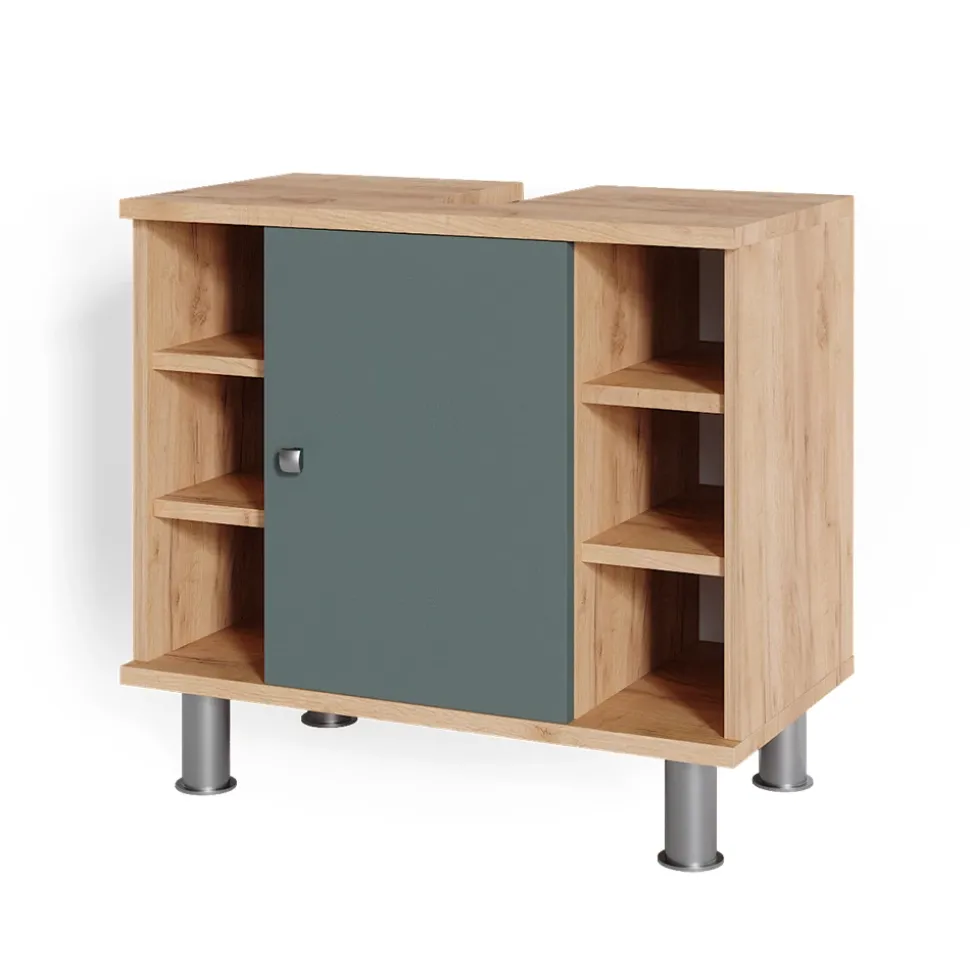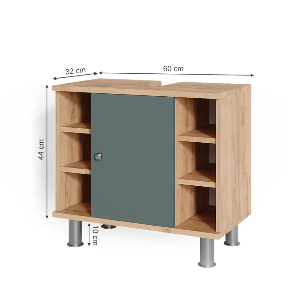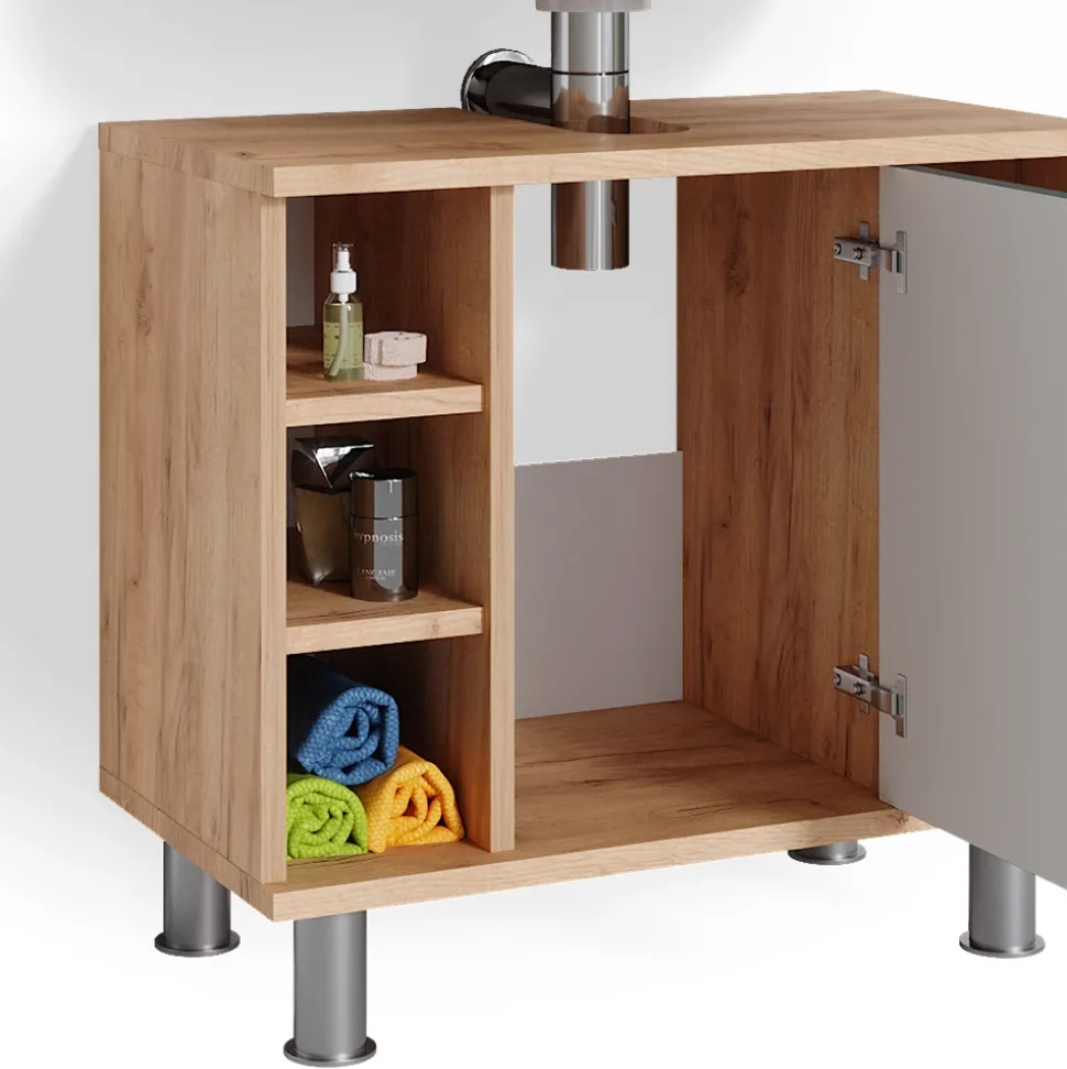 - Der Waschtischunterschrank hat eine Flügeltür und 6 offene Einlegeböden. Es gibt eine Aussparung für einen Siphon. Metallfüße sorgen für Standfestigkeit.