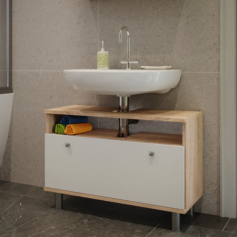 - Der Waschtischunterschrank mit Schublade bietet viel Stauraum dank seiner großen Schublade. Er ist platzsparend und funktional gestaltet, ideal für jedes Badezimmer.