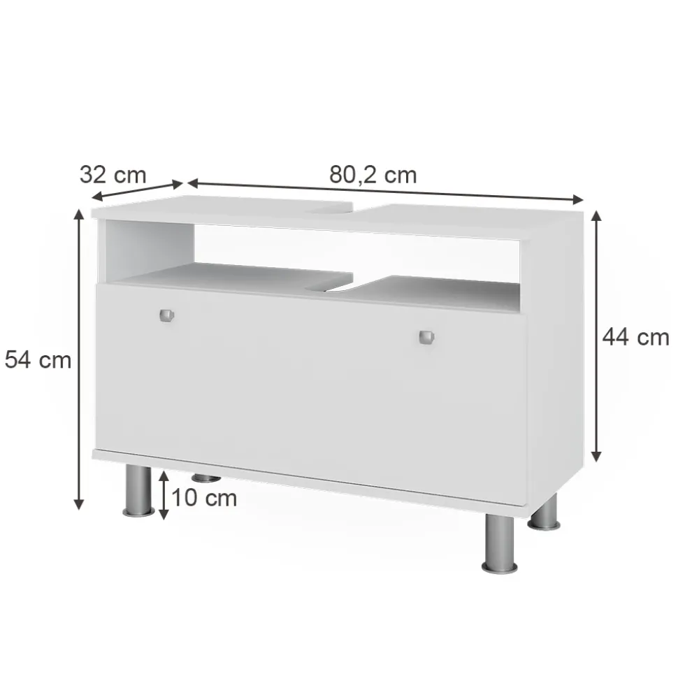 - MAßE: Der Unterschrank für das Badezimmer hat eine Tiefe von 32 cm, eine Breite von 80,2 cm und eine Höhe von 54 cm. Die detaillierten Größen sind auf den Fotos angegeben.
