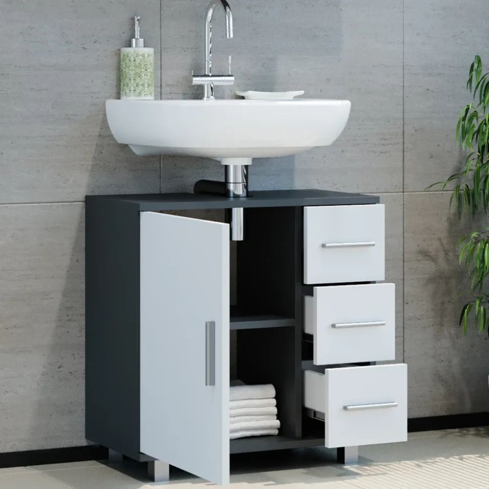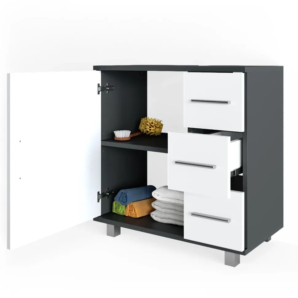 - Der Waschtischunterschrank mit Schubladen bietet eine perfekte Aufbewahrungslösung für das Badezimmer. Er verfügt über eine Flügeltür, 3 Schubladen sowie eine Aussparung für den Siphon.