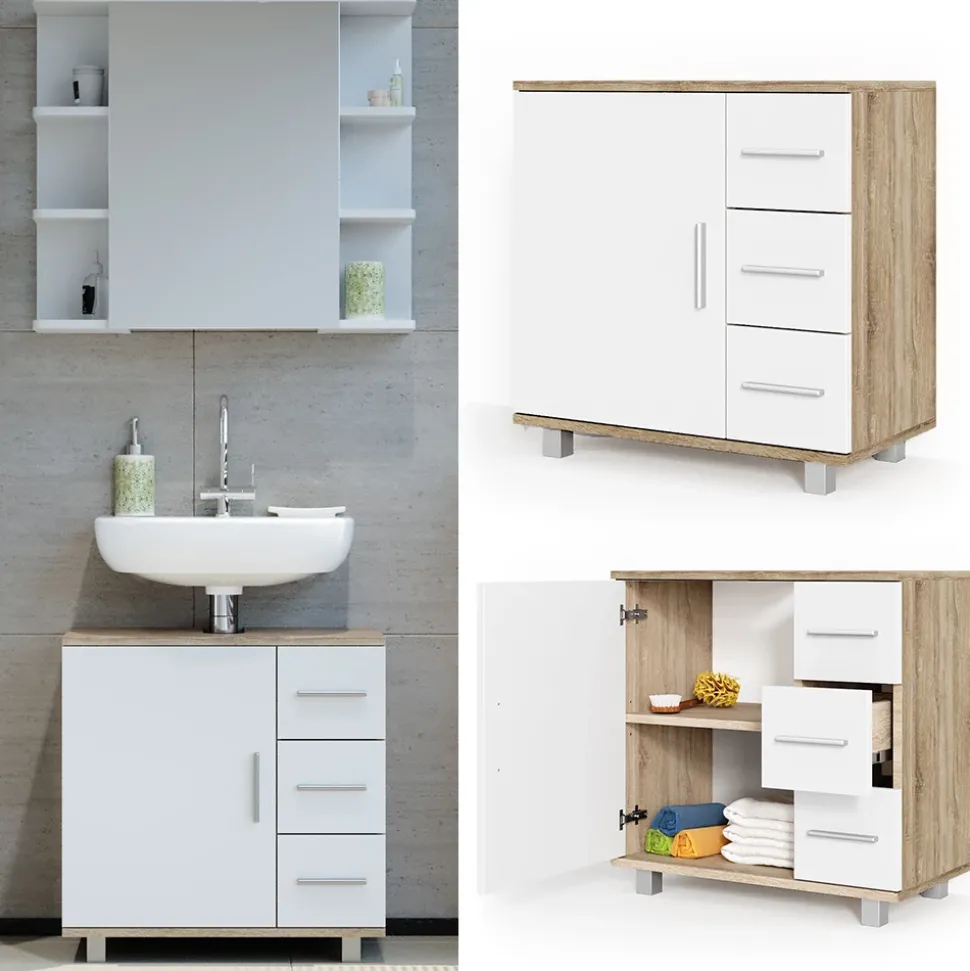 - Der Waschtischunterschrank mit Schubladen bietet eine perfekte Aufbewahrungslösung für Badezimmer. Mit Flügeltür und 3 Schubladen, sowie Aussparung für Siphon.