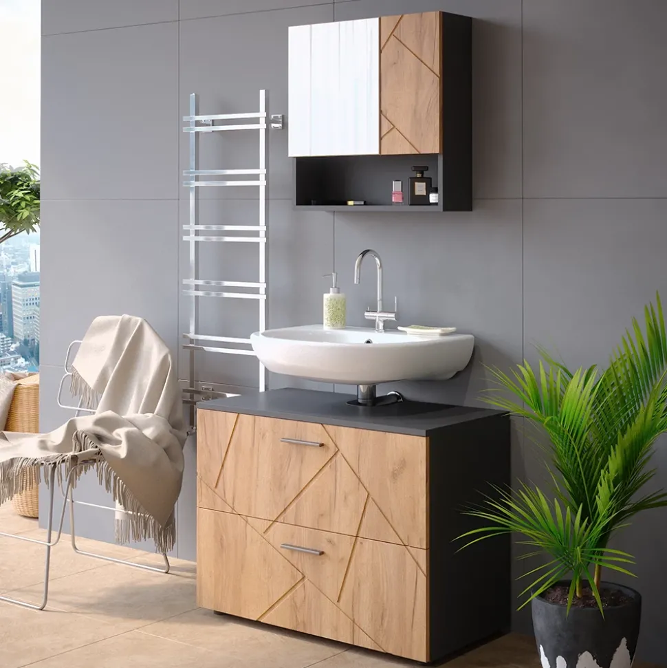 - MATERIAL: Der Badunterschrank besteht aus pflegeleichter Spanplatte 16 mm, mit einer Melaminharzbeschichtung. Einige Bestandteile des Artikels sind aus MDF gefertigt
