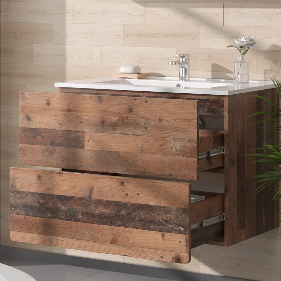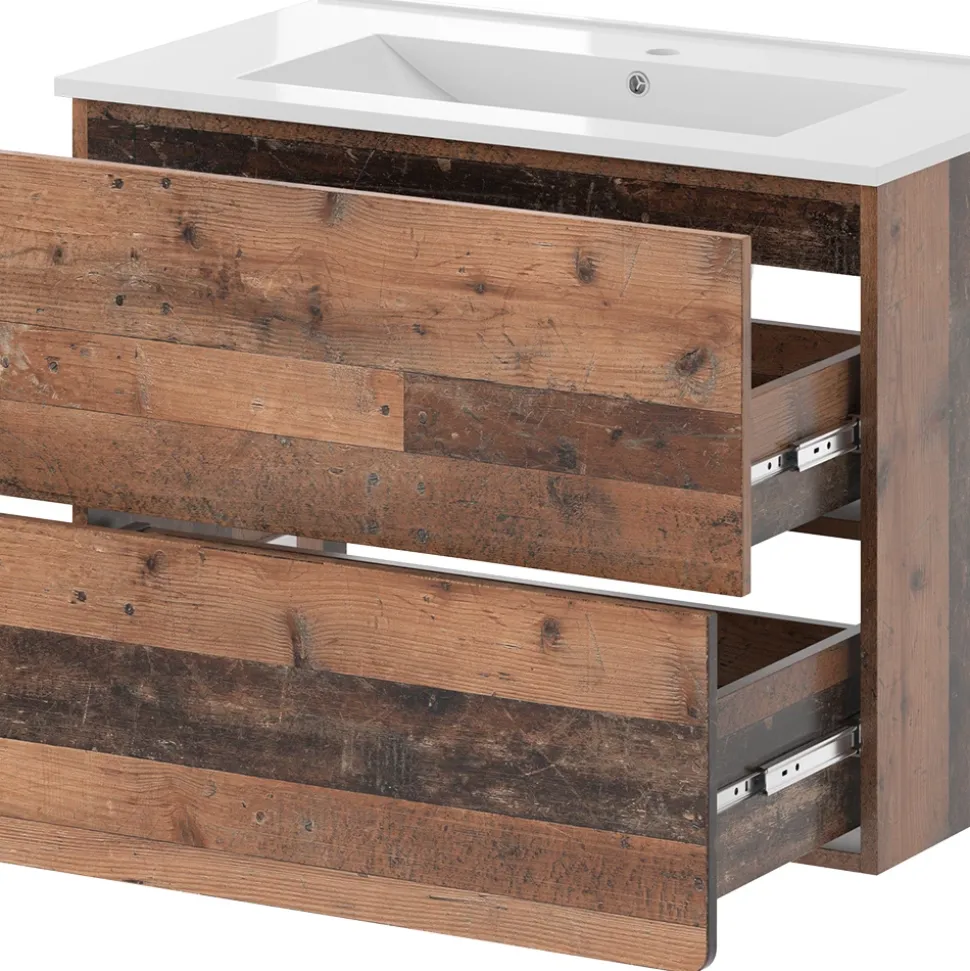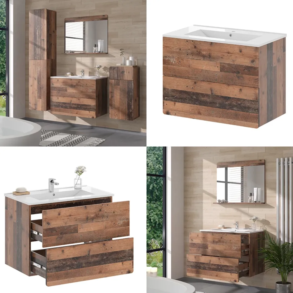 - MATERIAL: Das Badmöbel-Set besteht aus einer pflegeleichten 16 mm Spanplatte mit Melaminharzbeschichtung. Das Waschbecken ist aus Keramik gefertigt.