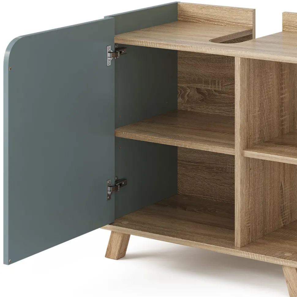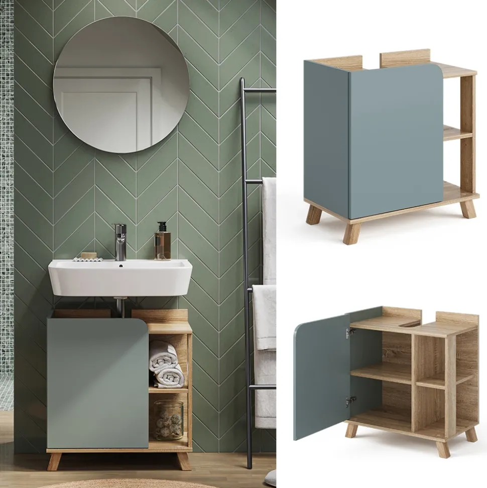 - Modern gestalteter Waschtischunterschrank, der je zwei geschlossene und offene Fächer, eine Tür sowie einen Ausschnitt für den Siphon bietet.