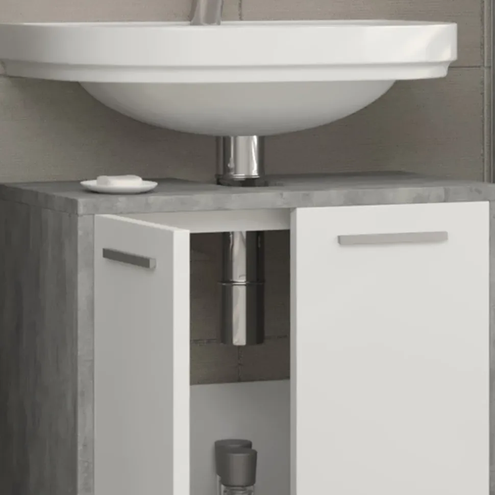 - Waschtischunterschrank mit zwei Flügeltüren, es gibt eine Aussparung für einen Siphon