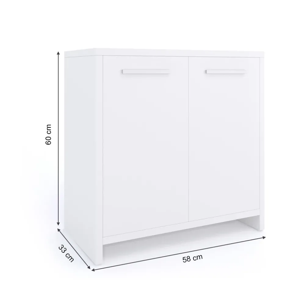 - MAßE: Der Unterschrank für das Badezimmer hat eine Breite von 58 cm, eine Höhe von 60 cm und eine Tiefe von 33 cm. Alle detaillierten Größen sind auf den Fotos angegeben.