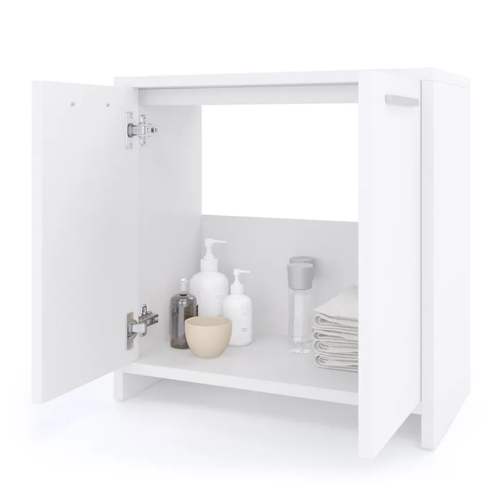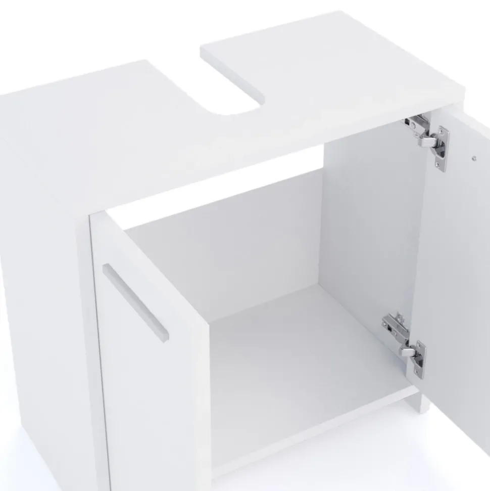 - Waschtischunterschrank mit zwei Flügeltüren, es gibt eine Aussparung für einen Siphon