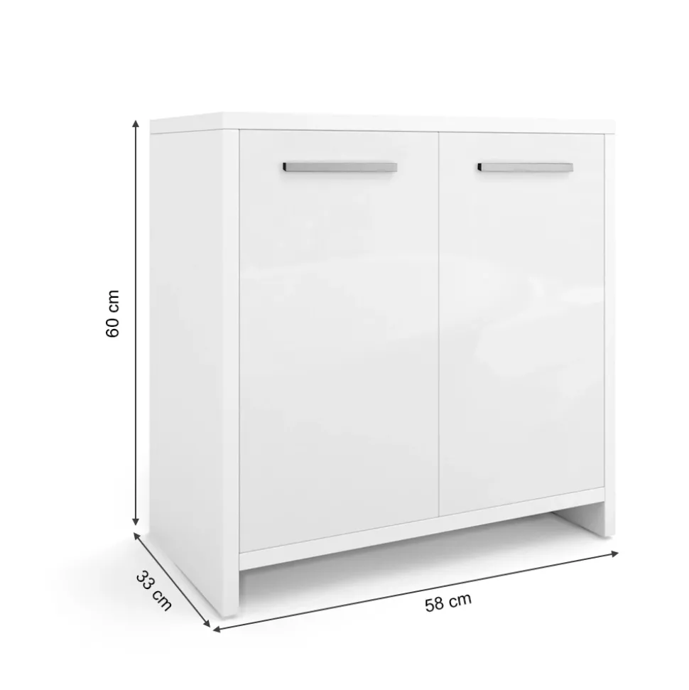 - MAßE: Der Unterschrank für das Badezimmer hat eine Breite von 58 cm, eine Höhe von 60 cm und eine Tiefe von 33 cm. Alle detaillierten Größen sind auf den Fotos angegeben.