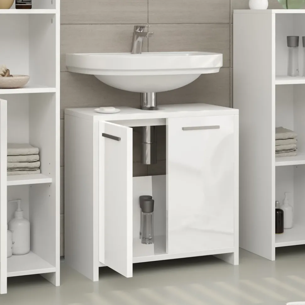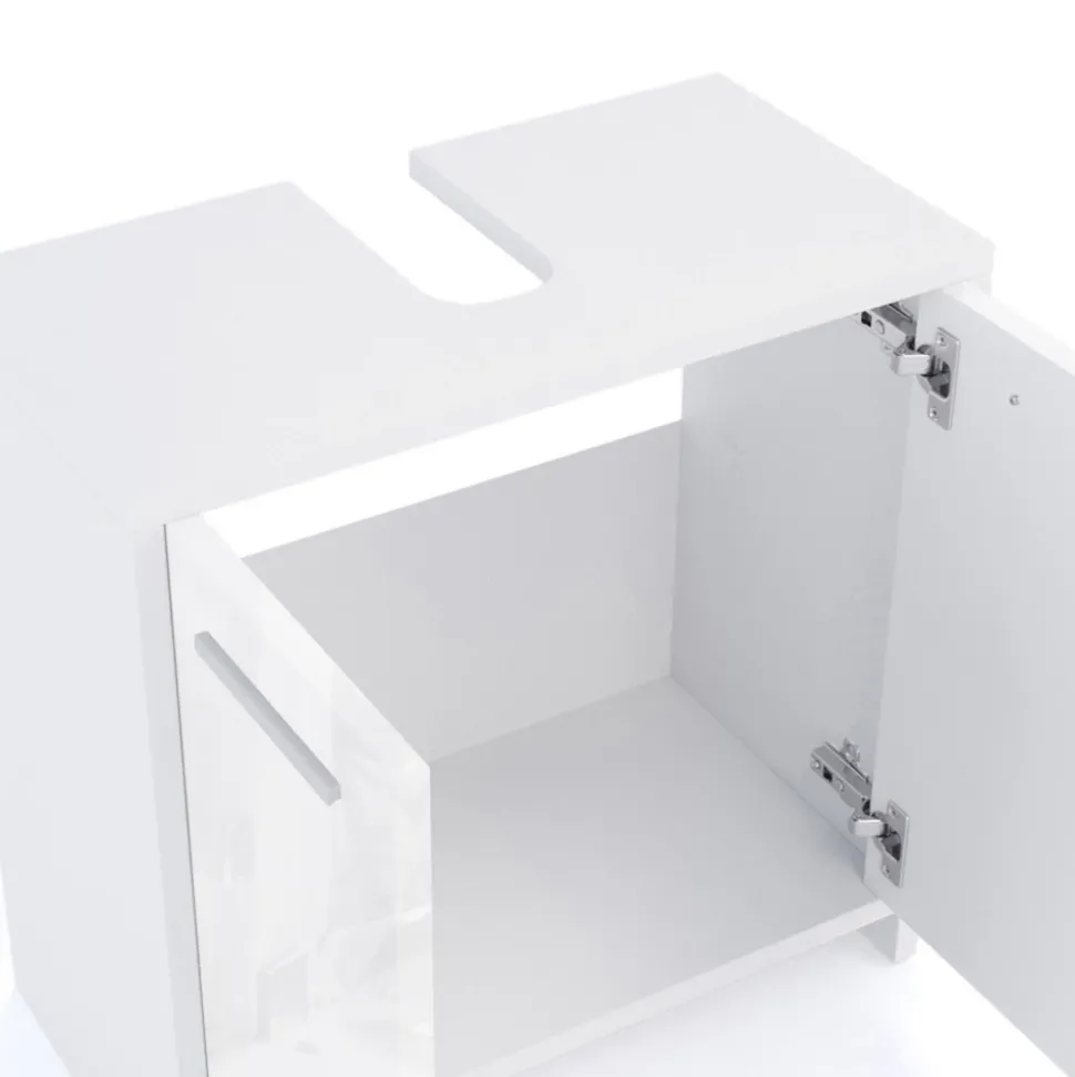 - Der Waschtischunterschrank mit zwei Flügeltüren, es gibt eine Aussparung für einen Siphon