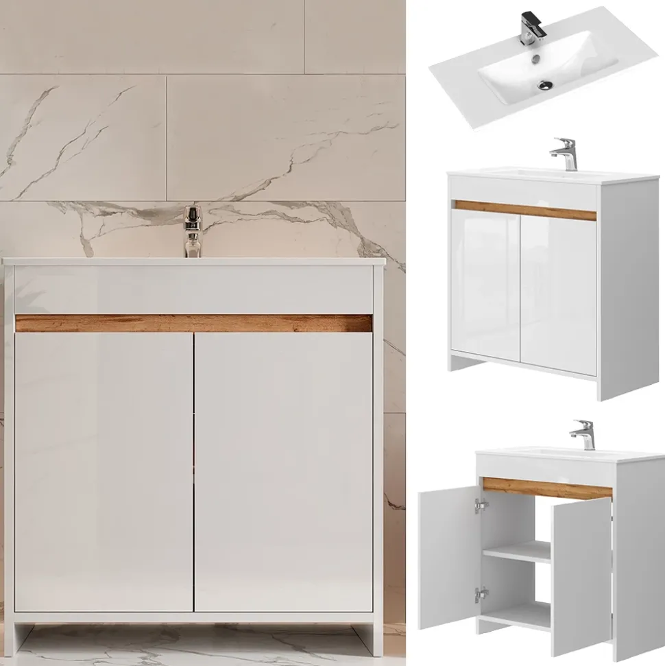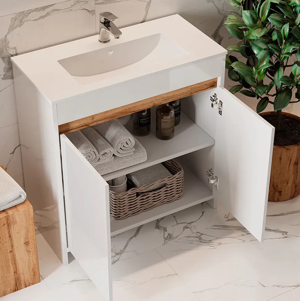 - Das Badezimmerschrank-Set verfügt über 2 Türen mit Soft-Close Scharnieren und wird mit einem Waschbecken geliefert. Ein praktisches und stilvolles Design für jedes Badezimmer.