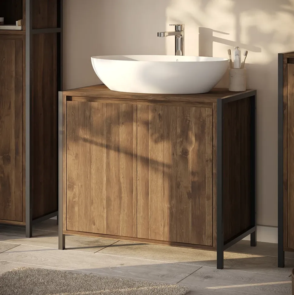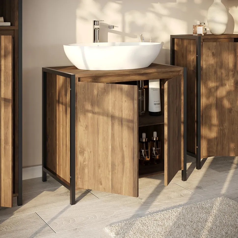 - MATERIAL: Der Waschbeckenunterschrank ist aus Spanplatte gefertigt. Für Stabilität sorgen pulverbeschichtete Stahlfüße.