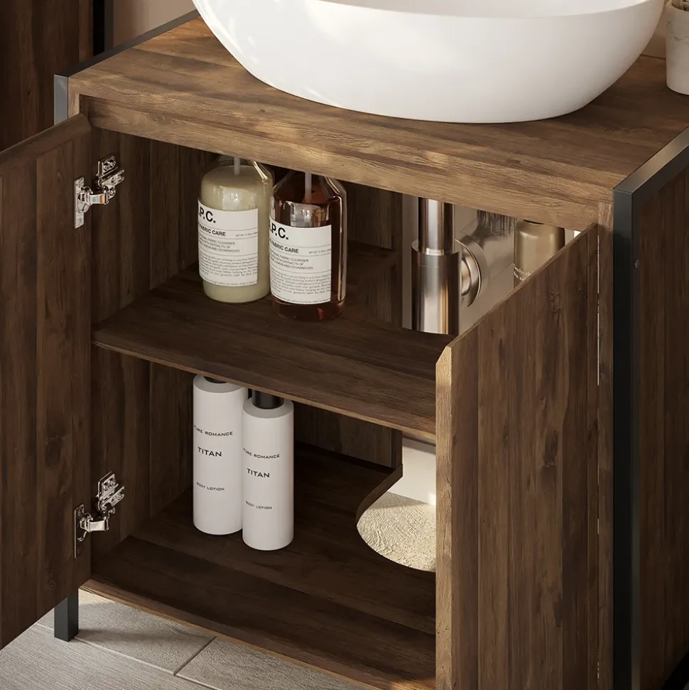 - Der Waschplatzschrank überzeugt durch seine stilvolle Holzoptik und bietet viel Stauraum für Pflegeprodukte – ein Badunterschrank, der Funktionalität und Design optimal verbindet.