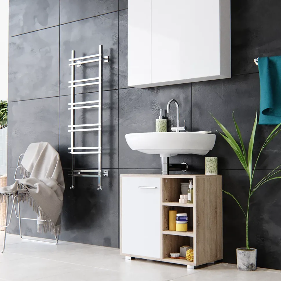 Der Waschbeckenunterschrank Perry ist ein kompakter und stilvoller Badunterschrank, der perfekt für kleinere Badezimmer geeignet ist. Er bietet ausreichend Stauraum für alle wichtigen Badezimmerutensilien und verfügt über eine Aussparung für einen Siphon. Die Flügeltür und die 3 offenen Ablageflächen sorgen für eine optimale Organisation und einfachen Zugriff auf alles, was Sie brauchen. Dieses Badmöbel ist Teil der Perry Kollektion und kann problemlos mit anderen Artikeln derselben Kollektion kombiniert werden.