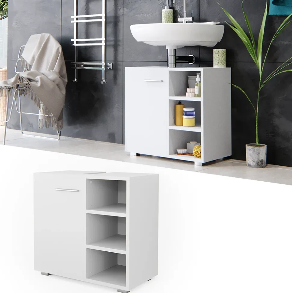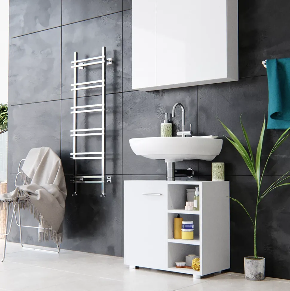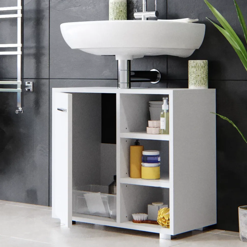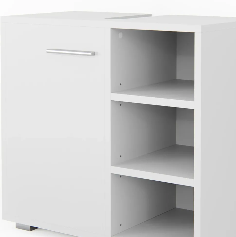 Der Waschbeckenunterschrank Perry ist ein kompakter und stilvoller Badunterschrank, der perfekt für kleinere Badezimmer geeignet ist. Er bietet ausreichend Stauraum für alle wichtigen Badezimmerutensilien und verfügt über eine Aussparung für einen Siphon. Die Flügeltür und die 3 offenen Ablageflächen sorgen für eine optimale Organisation und einfachen Zugriff auf alles, was Sie brauchen. Dieses Badmöbel ist Teil der Perry Kollektion und kann problemlos mit anderen Artikeln derselben Kollektion kombiniert werden.