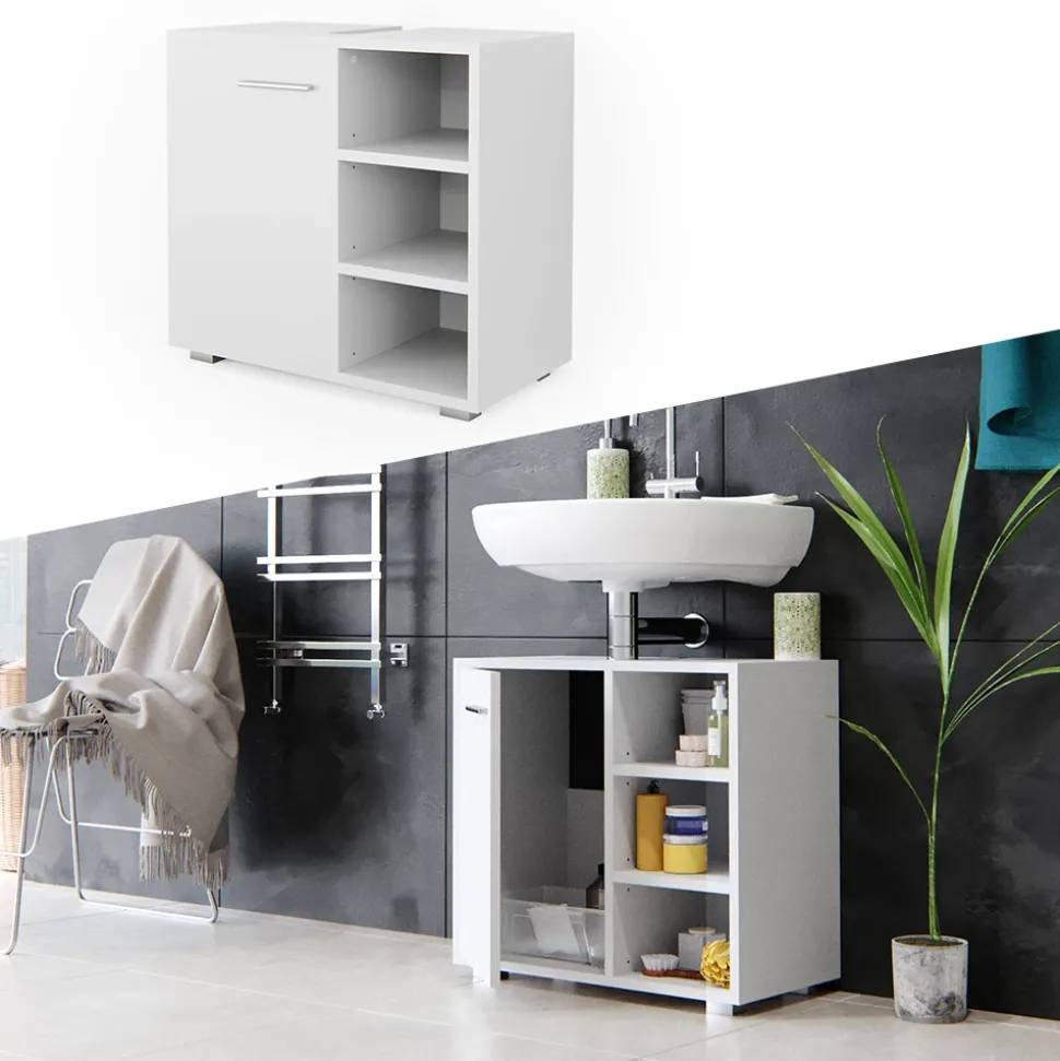 - Der Waschtischunterschrank hat eine Flügeltür und 3 offene Ablageflächen, es gibt eine Aussparung für einen Siphon.