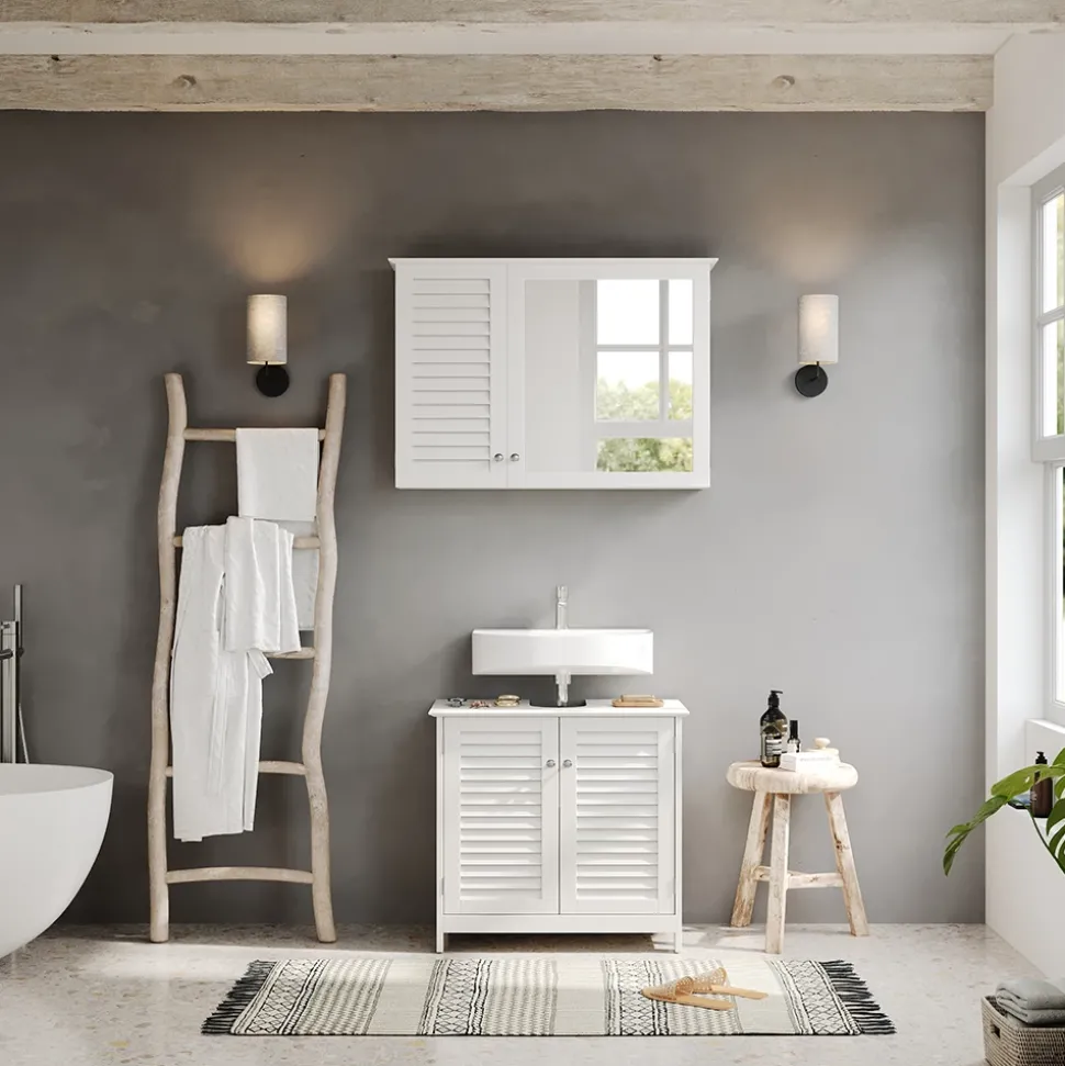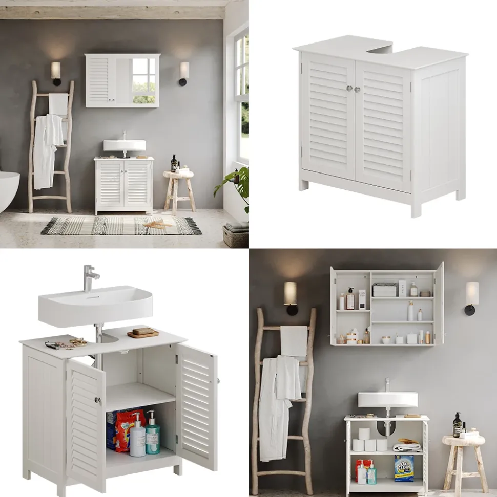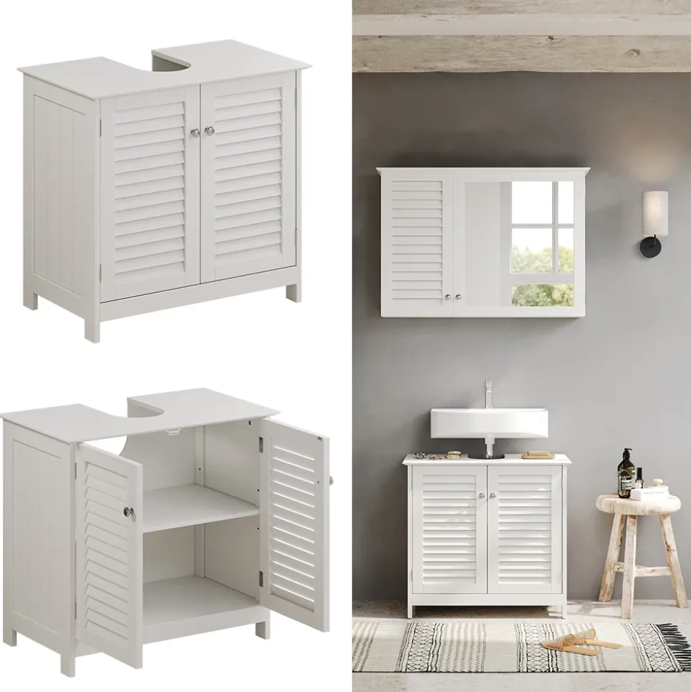 - Erleben Sie den Vicco Waschtischunterschrank Riad in Weiß. 2 clevere Türen sorgen für eine geordnete Badezimmeraufbewahrung. Perfekt für Ihr Waschbecken samt Kosmetikbedarf.