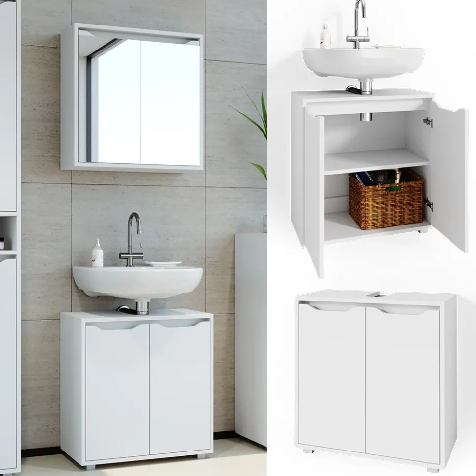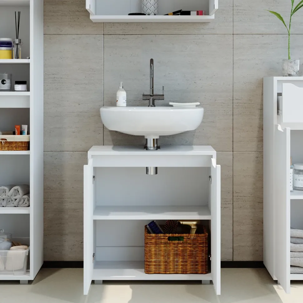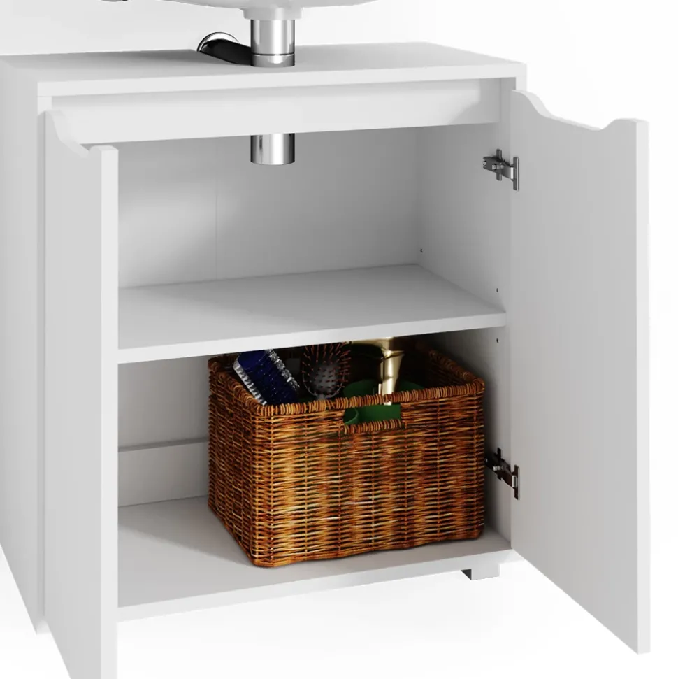 - Der Waschtischunterschrank in Weiß verfügt über zwei Flügeltüren und einer inneren Ablagefläche für zusätzlichen Stauraum.