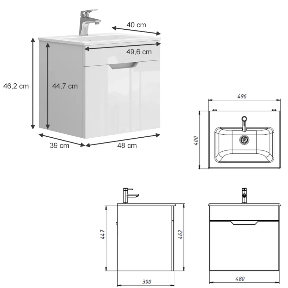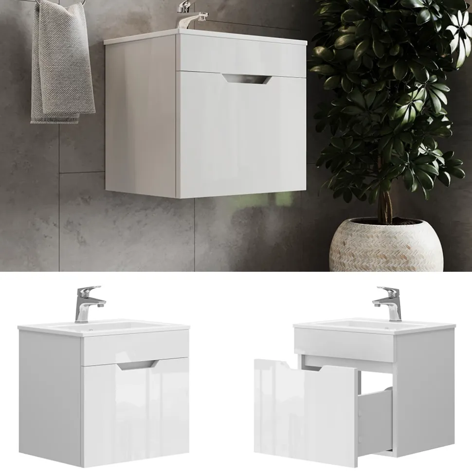 - Das Set mit Waschbeckenunterschrank bietet viel Stauraum und wird an der Wand montiert. Es enthält ein Waschbecken und ist eine praktische Lösung für das Bad.