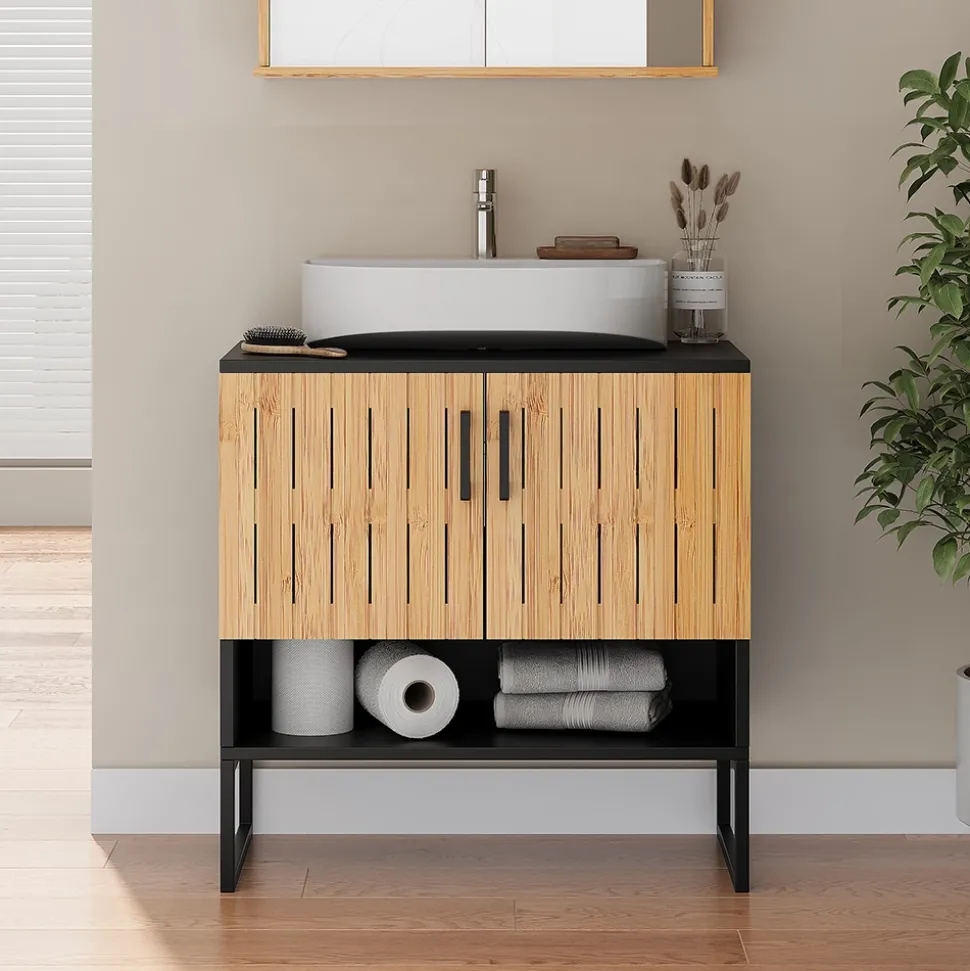 - MATERIAL: Der Waschbeckenunterschrank besteht aus pflegeleichtem MDF, 15 mm. Die Front ist aus lackiertem Bambus. Einige Bestandteile des Artikels sind aus Stahl, 16 mm gefertigt.
