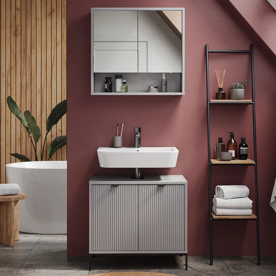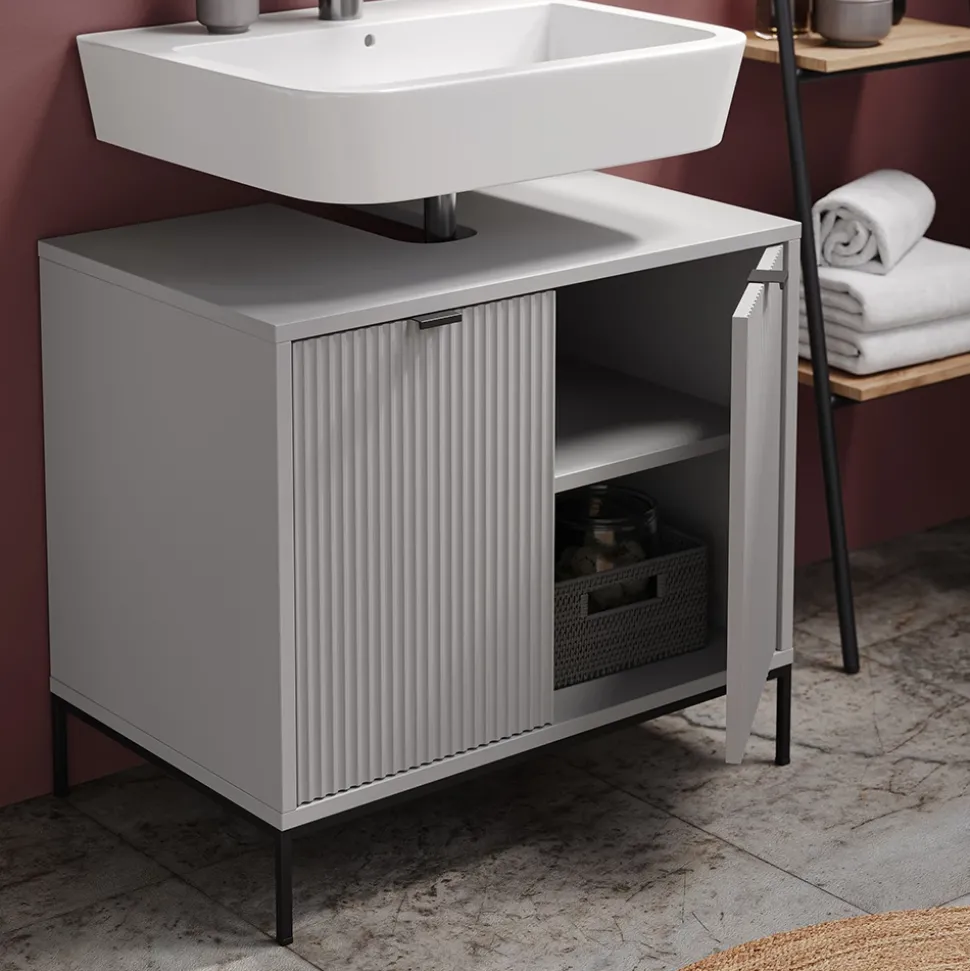 - Verleihen Sie Ihrem Badezimmer Eleganz mit dem Vicco Waschtischunterschrank Eliza in stilvollem Grau. 2 Türen bieten effektiven Stauraum für Ihre Badezimmerutensilien – ein idealer Schrank für das Bad